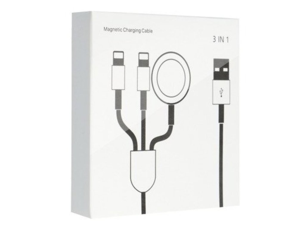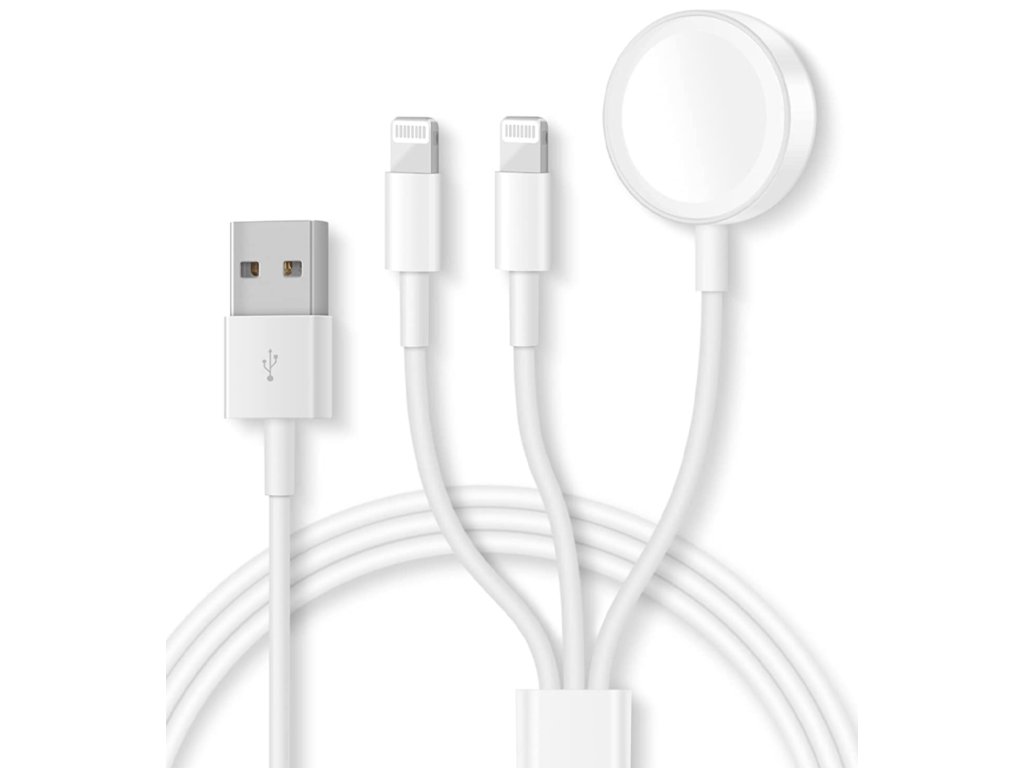 Kabel je vybaven ne jedním, ale hned třemi výstupy! Dva z výstupů jsou určeny pro nabíjení všech zařízení s portem lightning, jako jsou například Vaše iPhony nebo AirPods sluchátka. Třetí výstup je magnetické bezdrátové nabíjení pro Apple Watch.