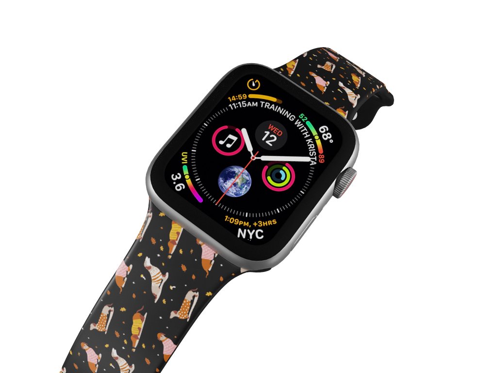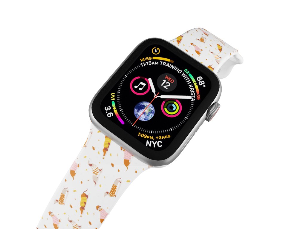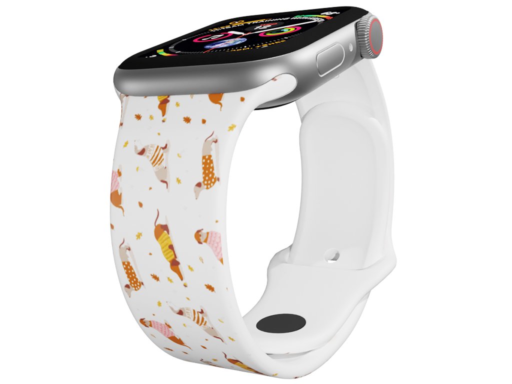 Potištěný náhradní řemínek pro Apple Watch s designem Jezevčíci ve svetru. Roztomilý jezevčík s charakteristicky dlouhým tělem a krátkýma nohama. Máme tu milovníky těchto krátkonohých mazlíčků?