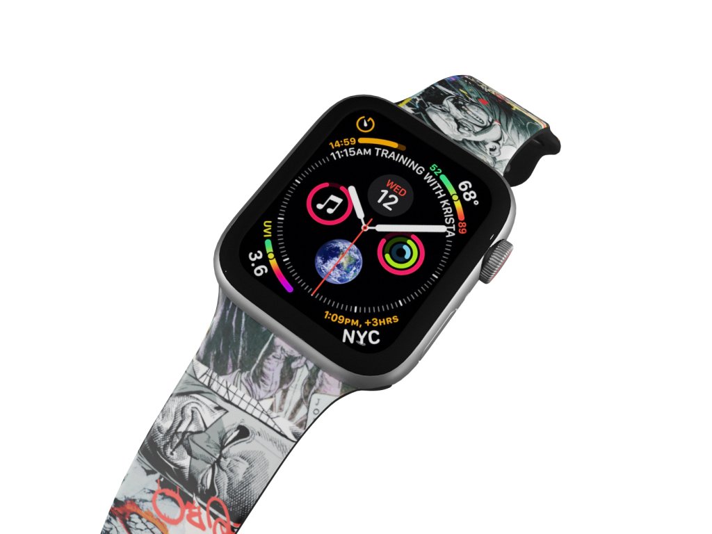 Potištěný náhradní řemínek pro Apple Watch s designem Batman 31 - Batman, Joker a Penguin. Ať už stojíte na temné straně nebo ještě té temnější. Ozdobte své hodinky páskem s potiskem komiksového příběhu Penguina, Jokera a Batmana najednou.