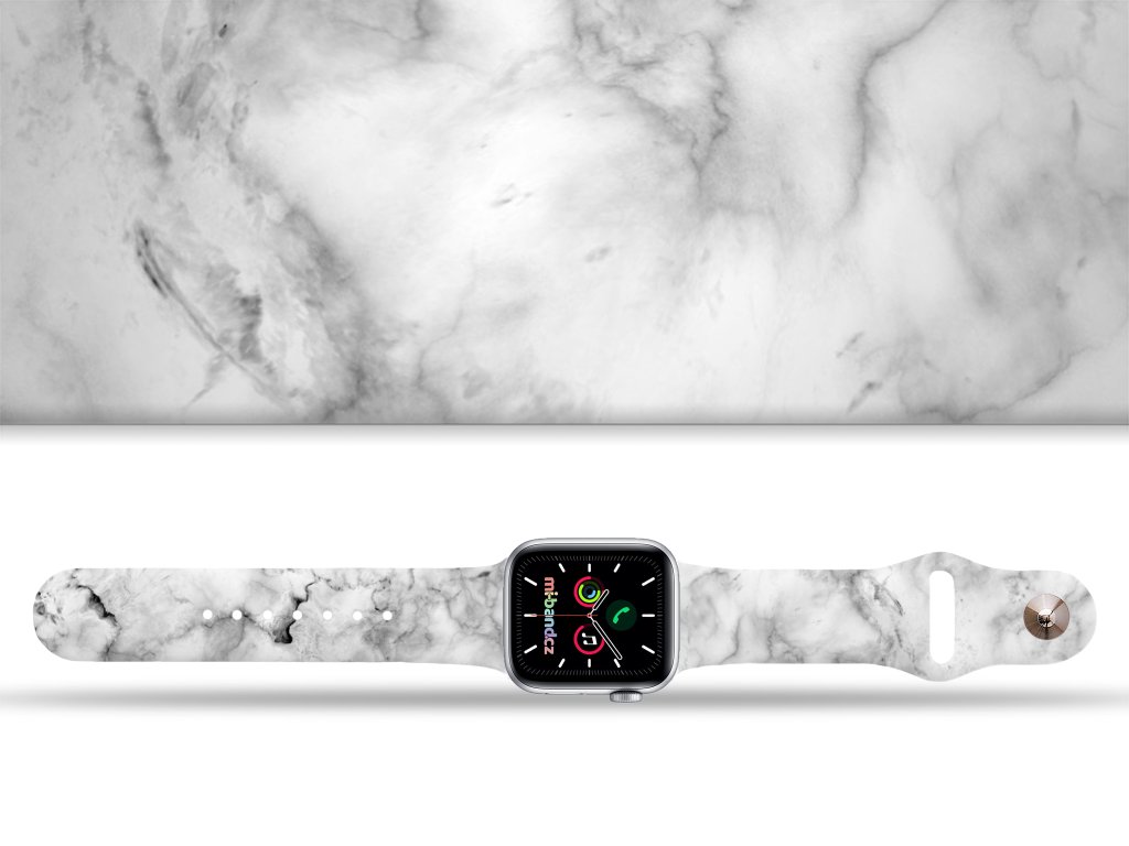Potištěný náhradní řemínek pro Apple Watch s designem Bílý mramor. Náhradní řemínek s potiskem mramoru dodává hodinkám elegantní a moderní vzhled. Tento stylový pásek je skvělou volbou pro každou příležitost, od každodenního nošení po speciální události.