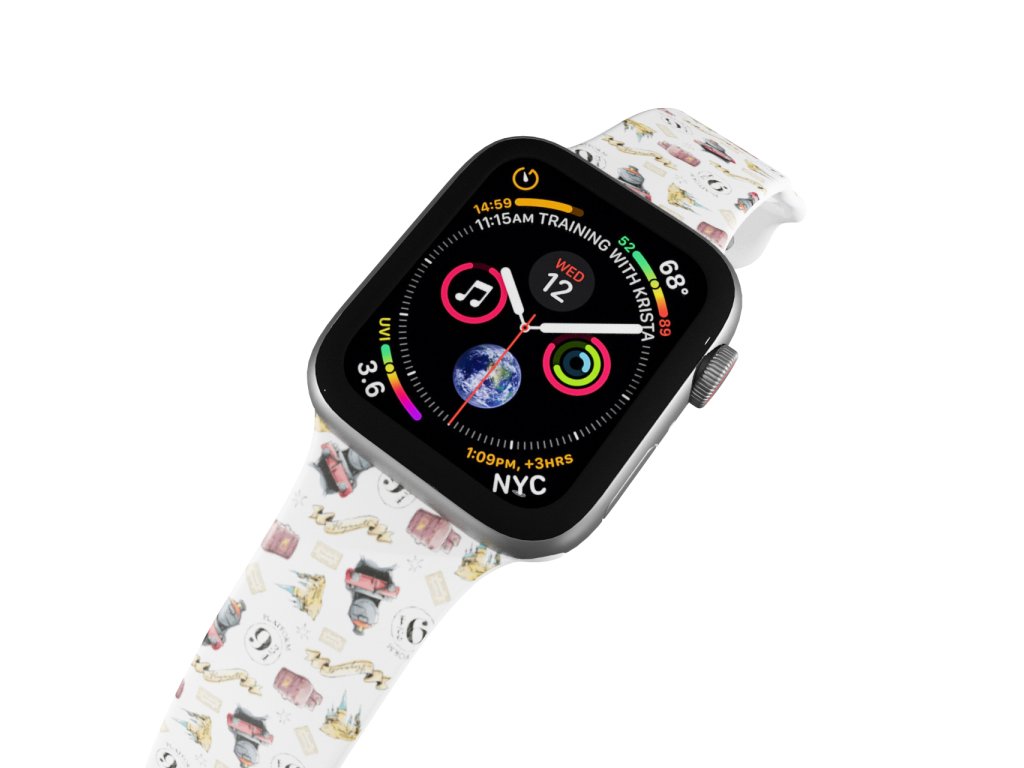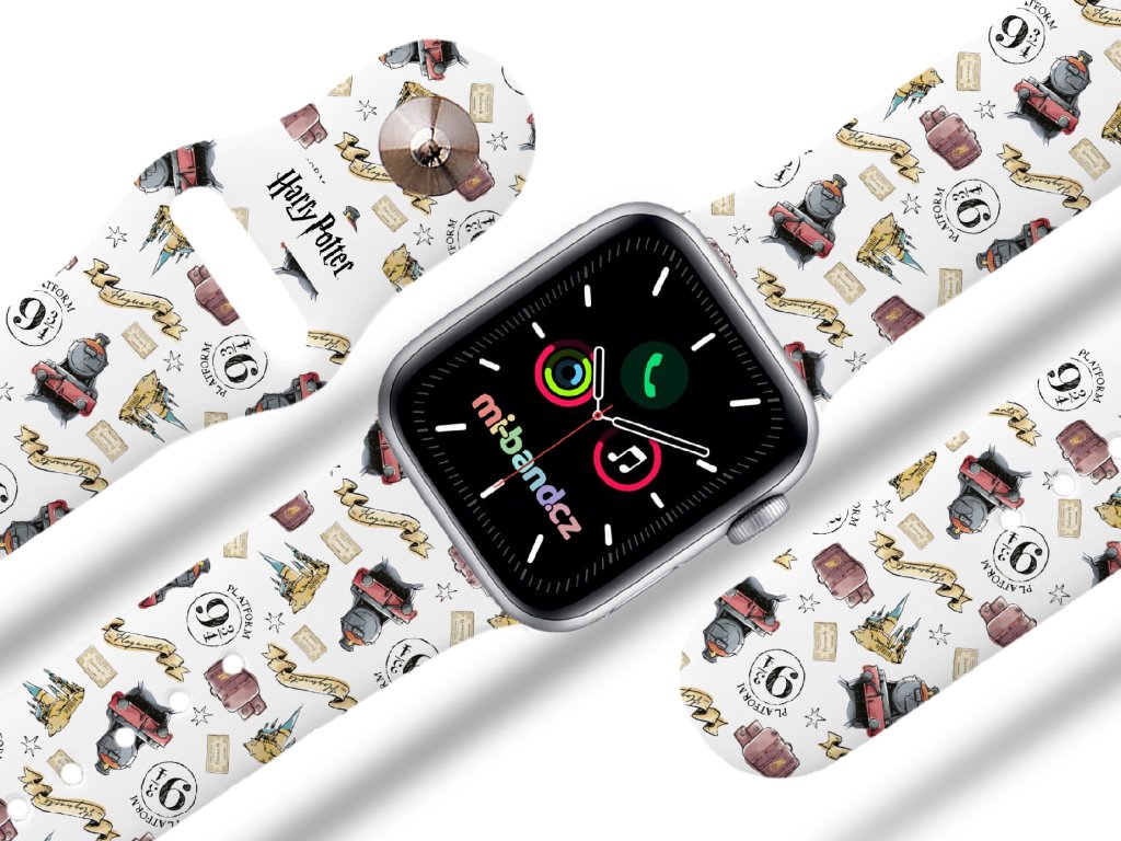 Potištěný náhradní řemínek pro Apple Watch s designem Bradavický expres 2. Náhradní řemínek se symboly Bradavické školy čar a kouzel. Bradavický expres, nástupiště 9 3/4 a Bradavice.