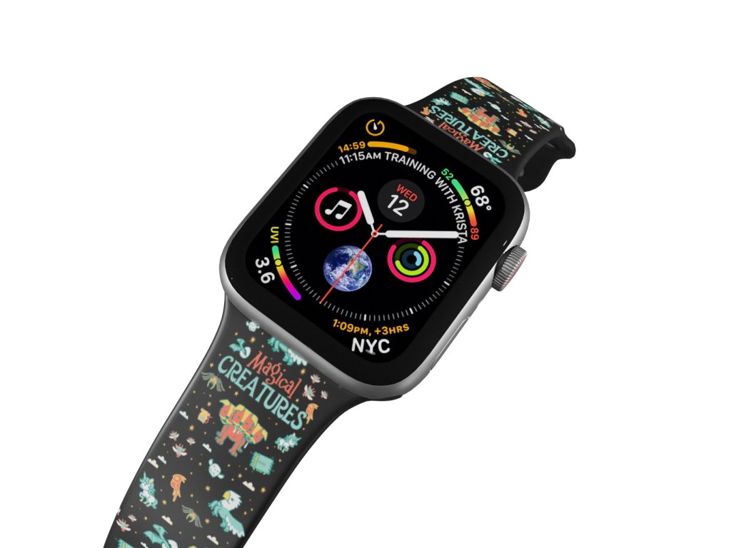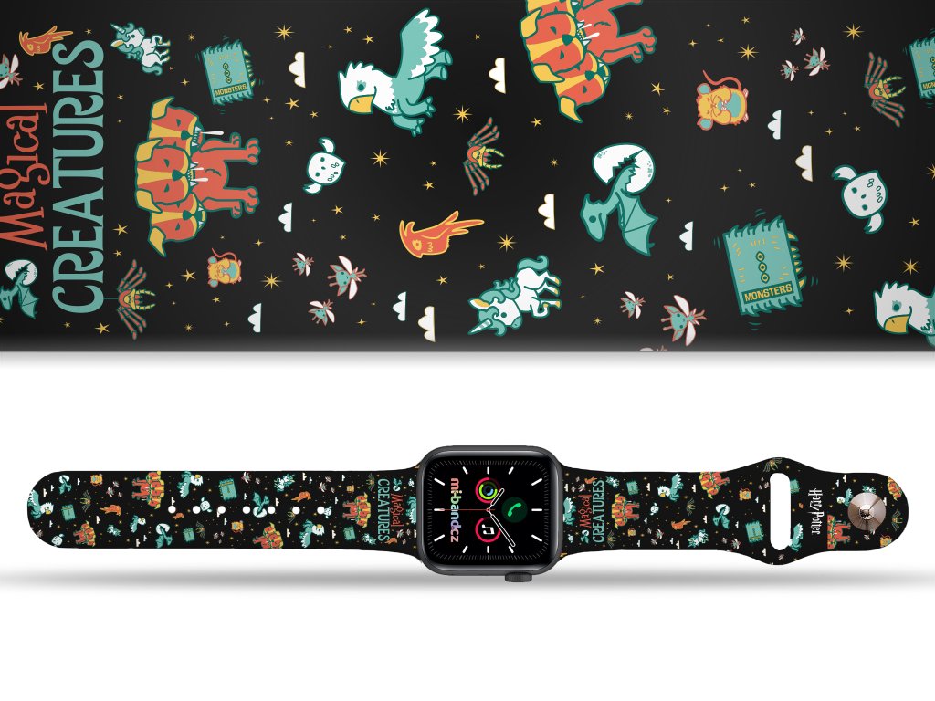 Potištěný náhradní řemínek pro Apple Watch s designem Harry Potter - Kouzelná stvoření. Chloupek, Klofan, Hedvika, Mýtický jednorožec a spousta dalších z kouzelnického světa Harryho Pottera.