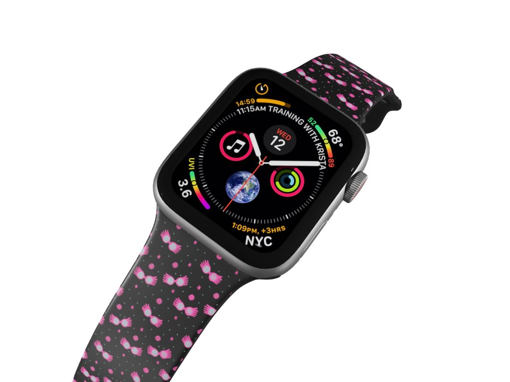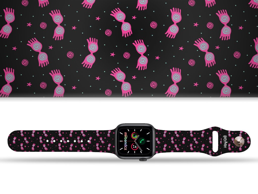 Potištěný náhradní řemínek pro Apple Watch s designem Harry Potter - Strašibrýle. Pásek s růžovým potiskem strašibrýlí. Brýle odhalují strachopudy a díky nim našla Lenka Láskorádová ve vlaku Harryho Pottera.