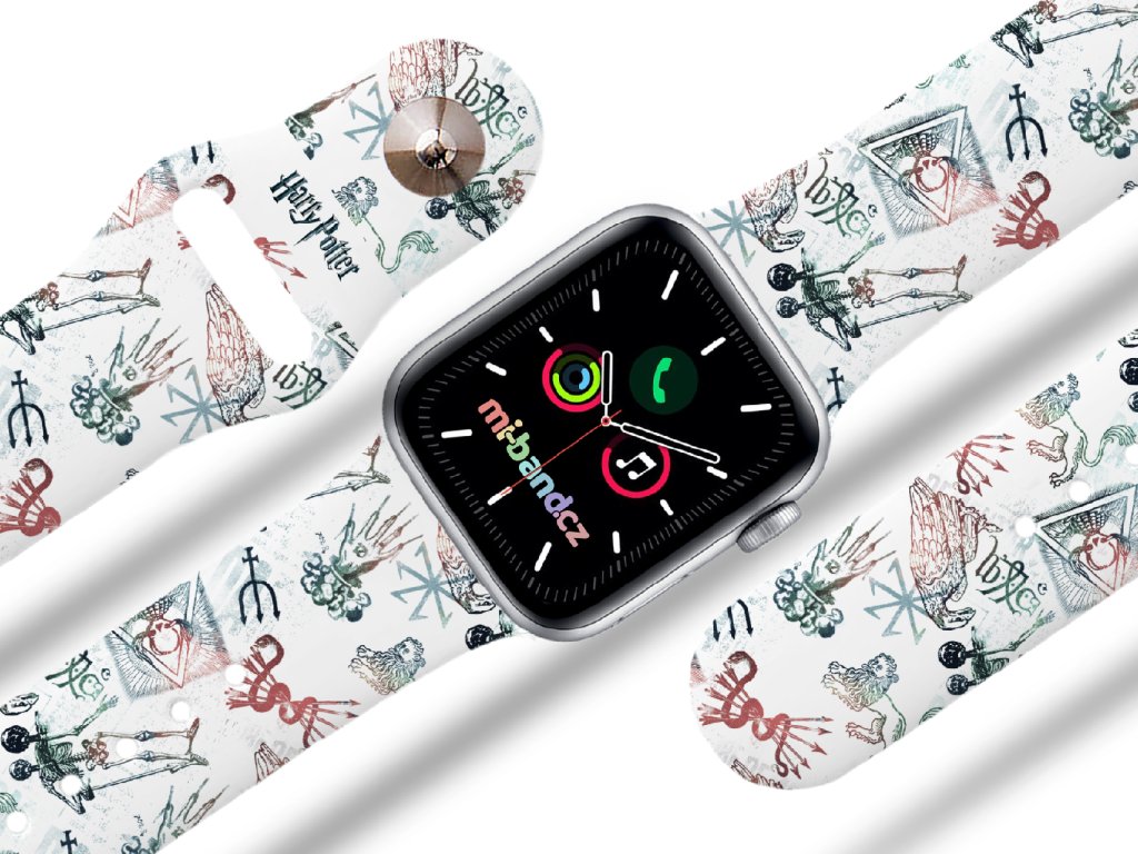 Potištěný náhradní řemínek pro Apple Watch s designem Harry Potter - Symboly magie. Magické symboly pro tvé Apple Watch. Vše, co by měl správný kouzelník mít. Je čas oprášit znalosti a zase se vrátit do Bradavické školy čar a kouzel.