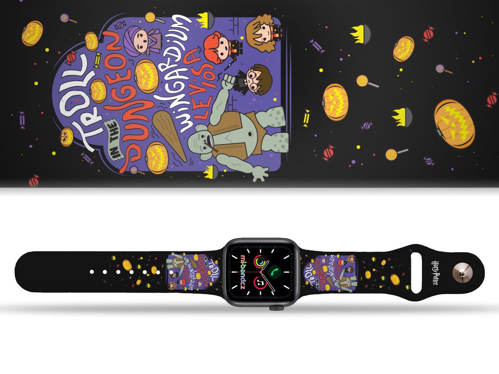 Potištěný náhradní řemínek pro Apple Watch s designem Harry Potter - Trol ve sklepení charms. Pásek s potiskem horského trolla ze sklepení Bradavické školy čar a kouzel. Je čas oprášit znalosti, ale pozor, ať nemáte na hůlce trolí holuby.