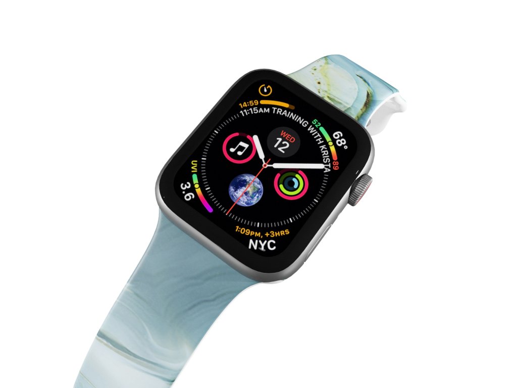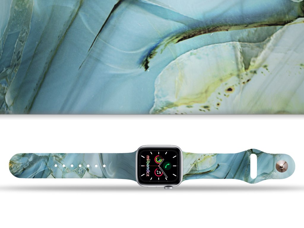 Potištěný náhradní řemínek pro Apple Watch s designem Modro-šedý mramor. Náhradní řemínek pro Apple Watch s celopotiskem modro-šedého mramoru s dotekem zlata. Omamná kombinace pro pásek tvých hodinek, která dokonale ladí.