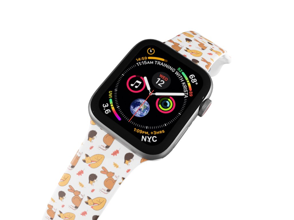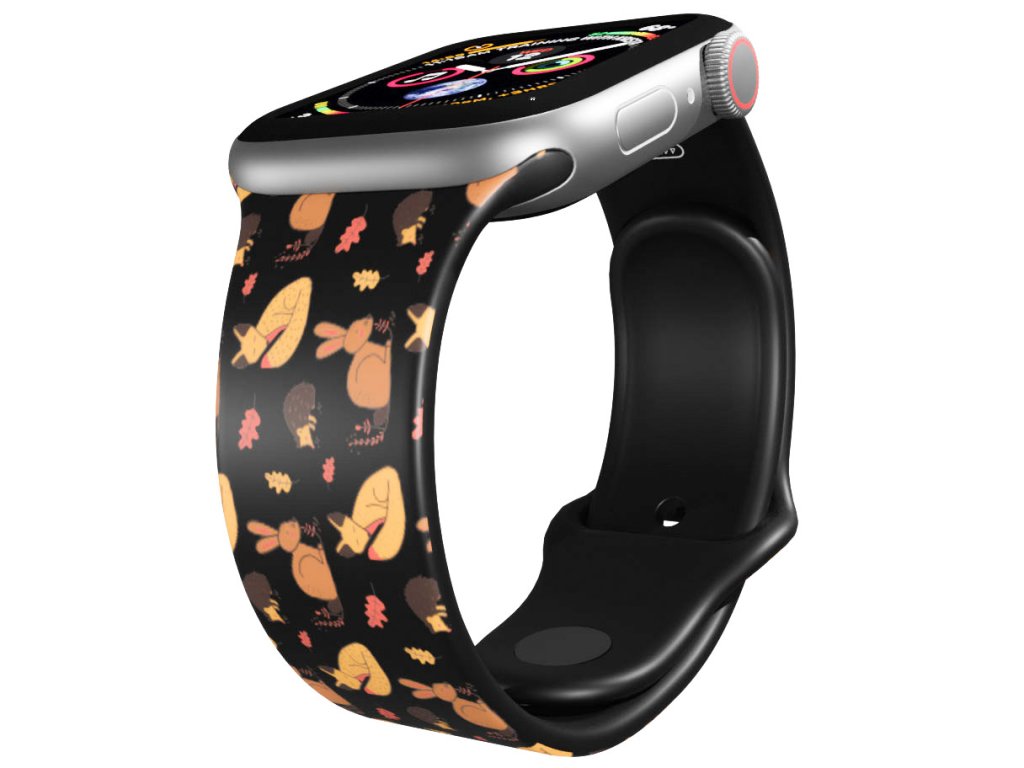 Potištěný náhradní řemínek pro Apple Watch s designem Podzimní lesní zvěř. Pozvěte si domů lišku, zajíčka nebo ježka i s podzimním listím.