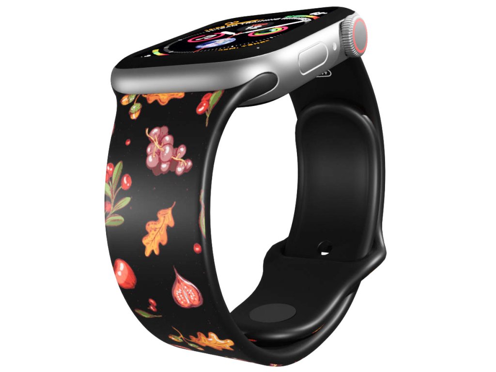 Potištěný náhradní řemínek pro Apple Watch s designem Podzimní nadílka. Zlatavý podzim, vůně zralého ovoce a chladný vánek ve vlasech. Oranžové dubové lístečky, víno a další podzimní bobulky.