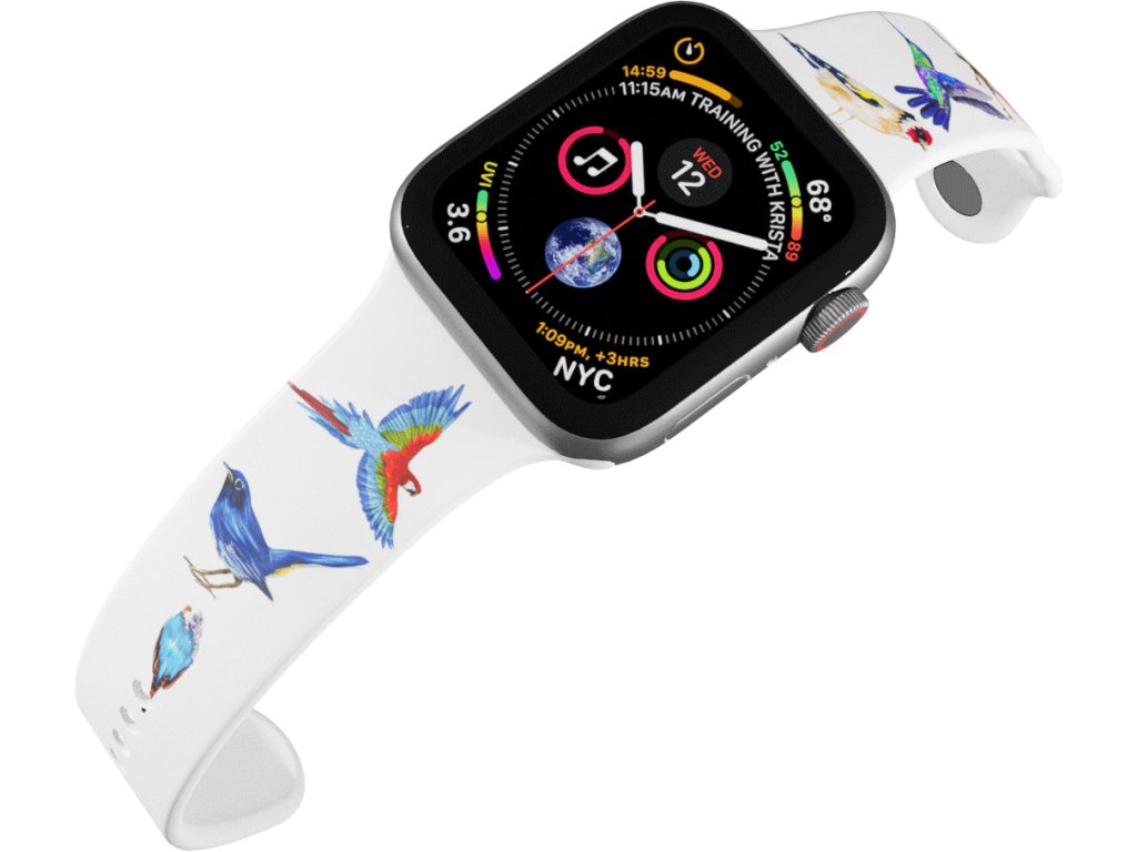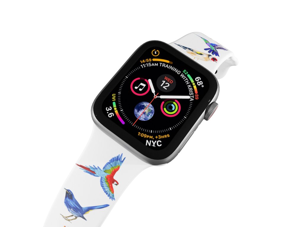 Potištěný náhradní řemínek pro Apple Watch s designem Ptáčci. Vypadá to na přehlídku exotického ptactva. Papoušek, Andulka i vzácný kolibřík. Kdo je další?