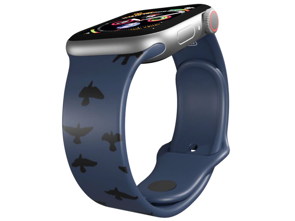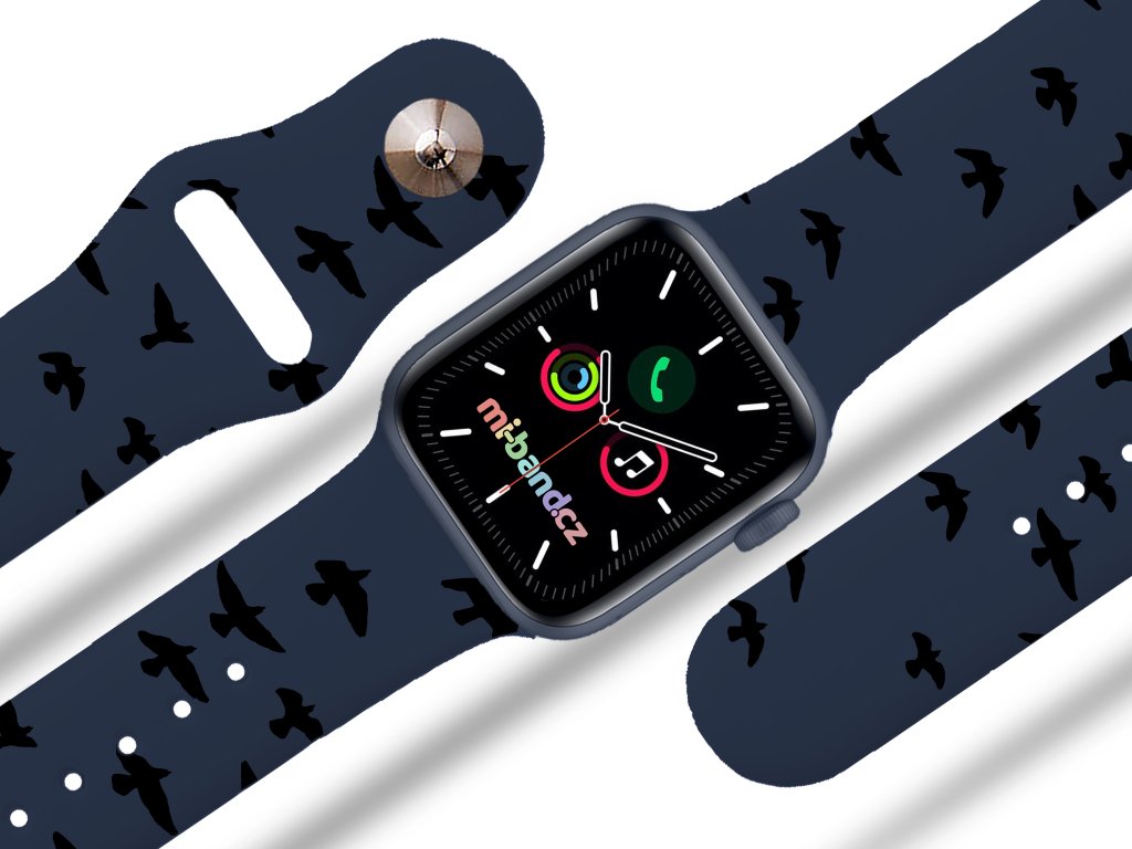 Potištěný náhradní řemínek pro Apple Watch s designem Ptáci. Podívejte na oblohu, vzlétlo hejno ptáků a doletělo až k vám. Jejda, zahnízdili vám i na hodinkách.