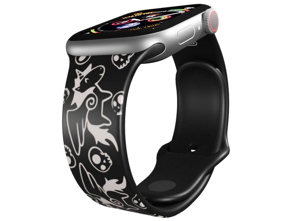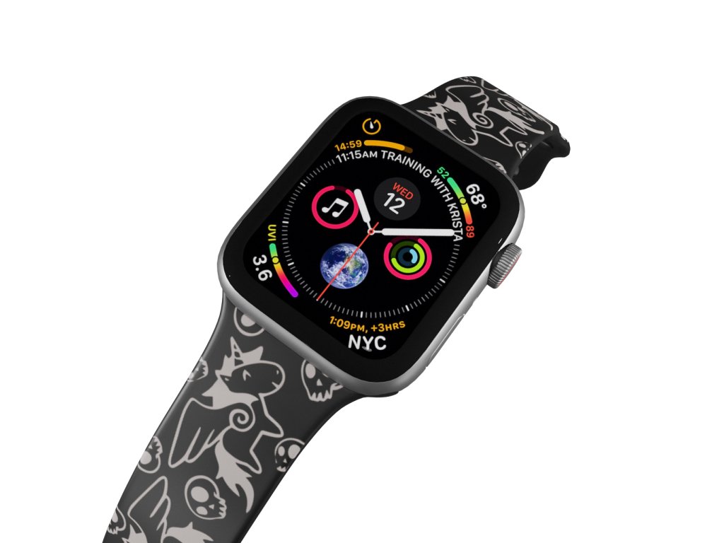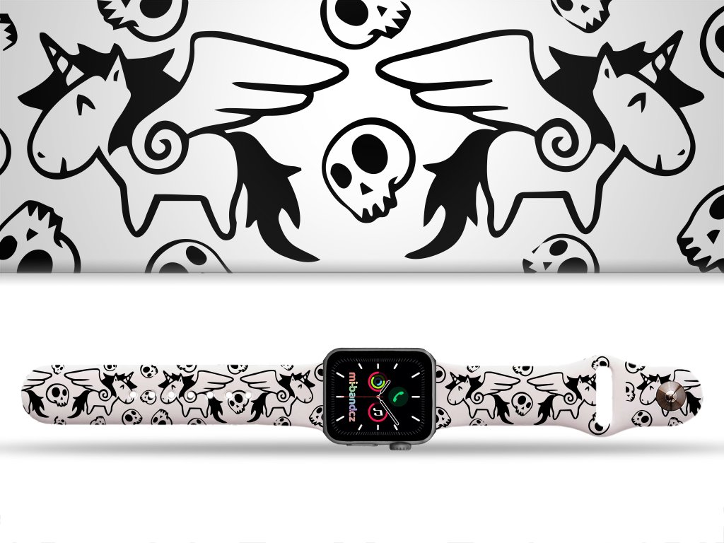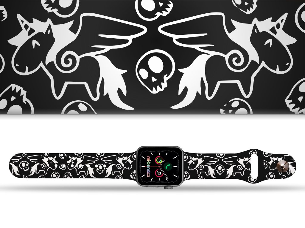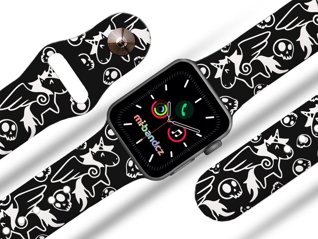 Potištěný náhradní řemínek pro Apple Watch s designem Unicorn black. Fantastický svět nadpřirozených zvířat na vašem pásku. Jednorožci a lebky v jednom spojení.