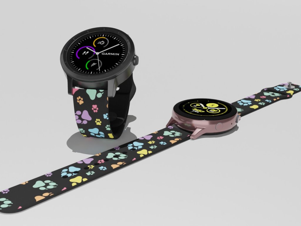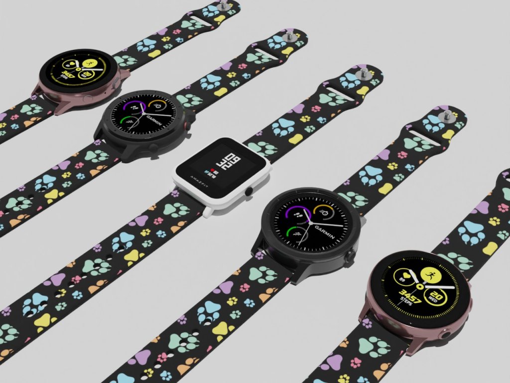 Černý náhradní řemínek s barevnou grafikou psích tlapek.