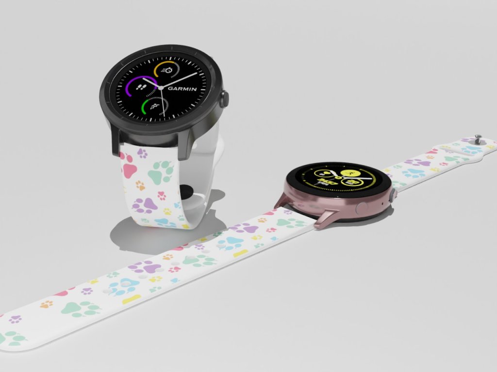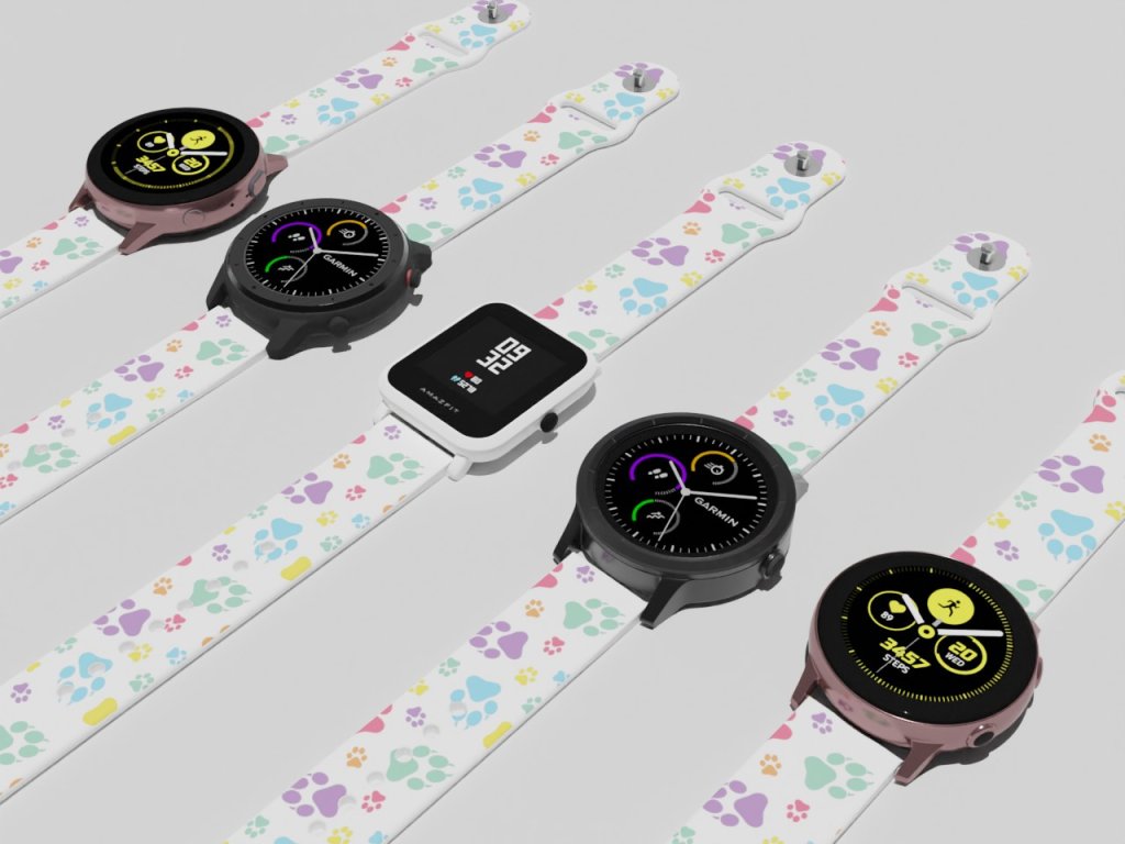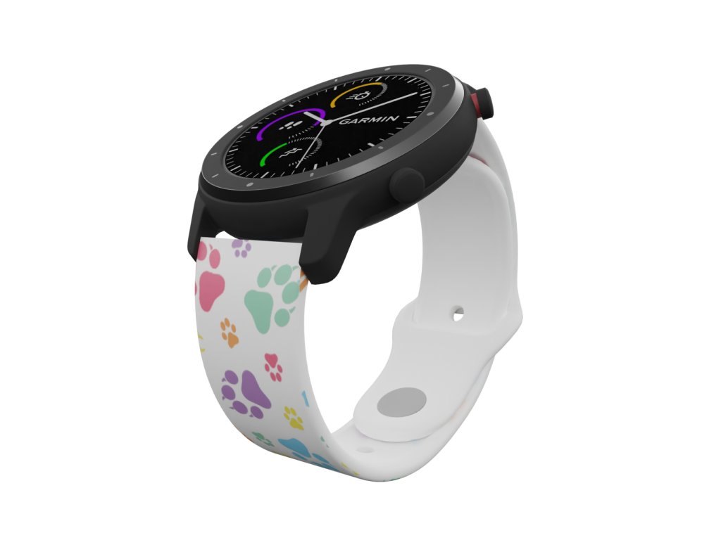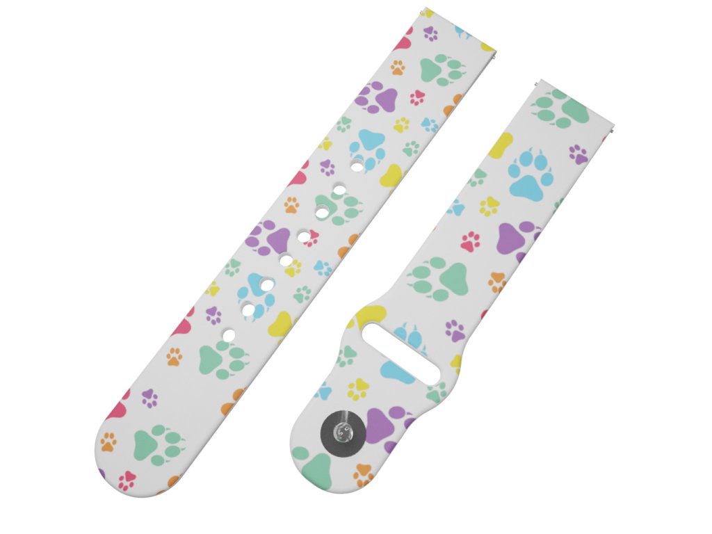 Bílý náhradní řemínek s barevnou grafikou psích tlapek. Navrženo našimi čtyřnohými miláčky, kteří se nám proběhli po domě s tlapkami od barvy. Od čivavy po vlka s upřímnou psí láskou přímo pro vás.