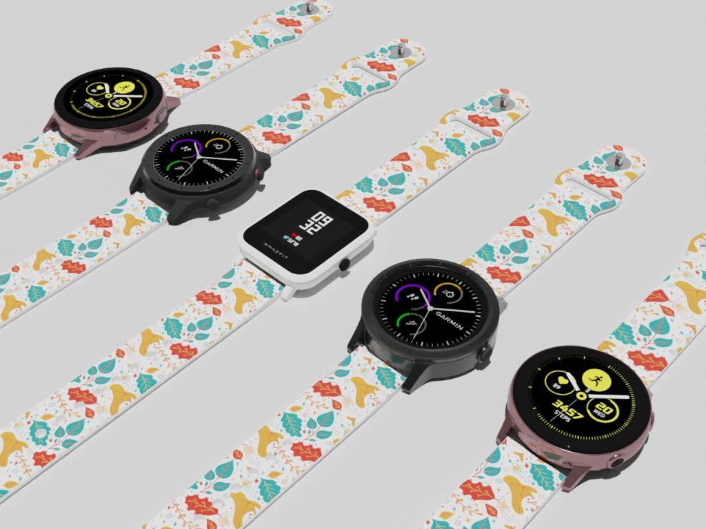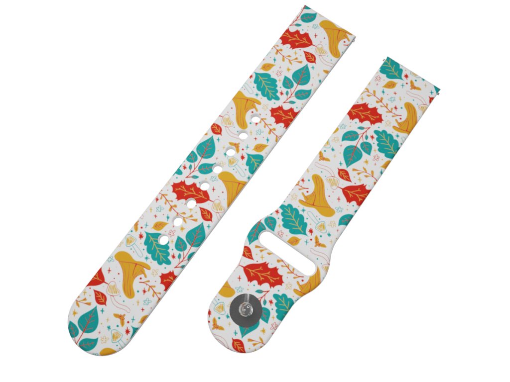 Bílý náhradní řemínek s motivy lístečků a houbiček v podzimních barvách. Užívejte