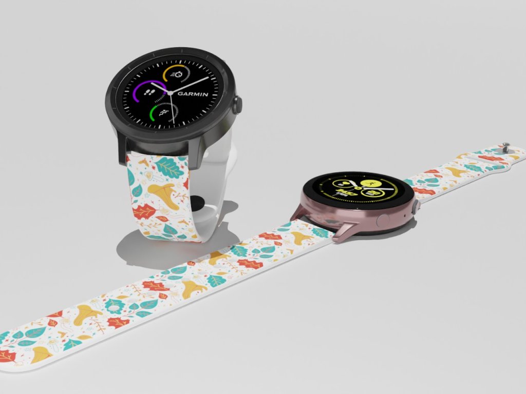 Bílý náhradní řemínek s motivy lístečků a houbiček v podzimních barvách. Užívejte si krásy podzimu v každém ročním období.