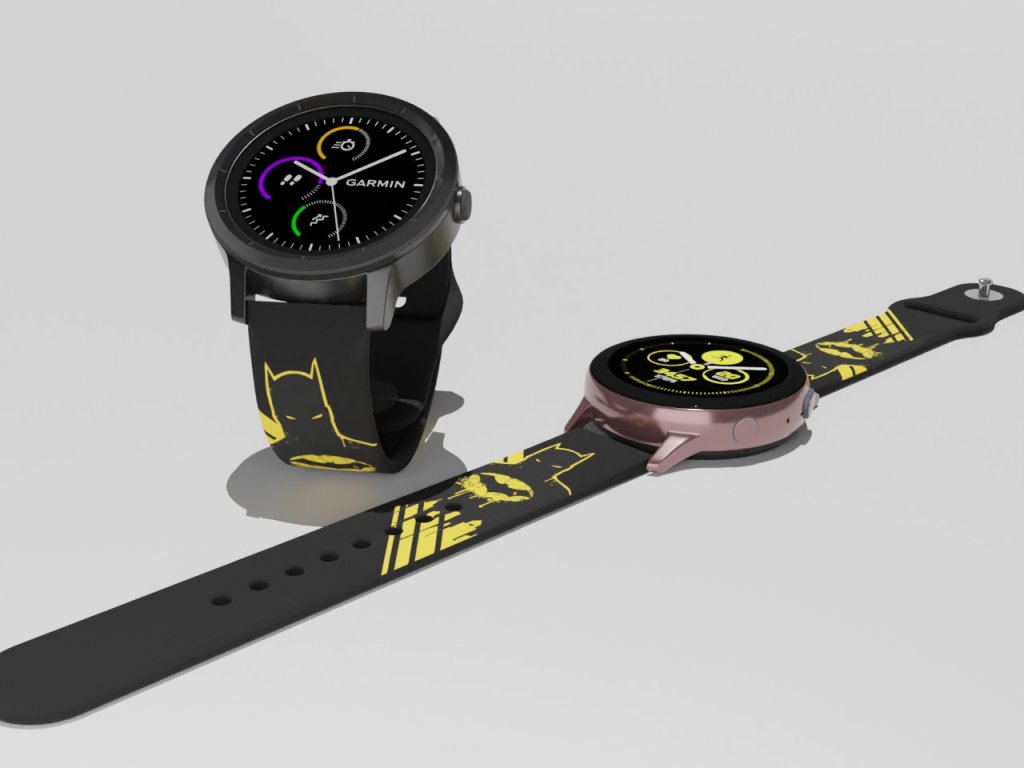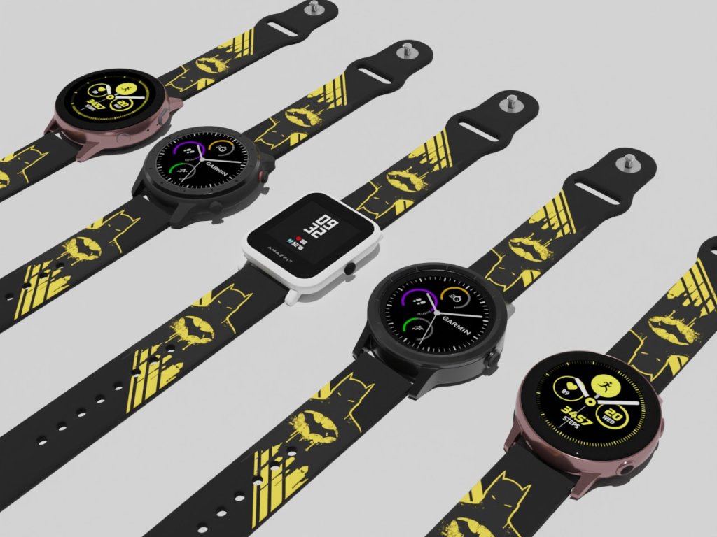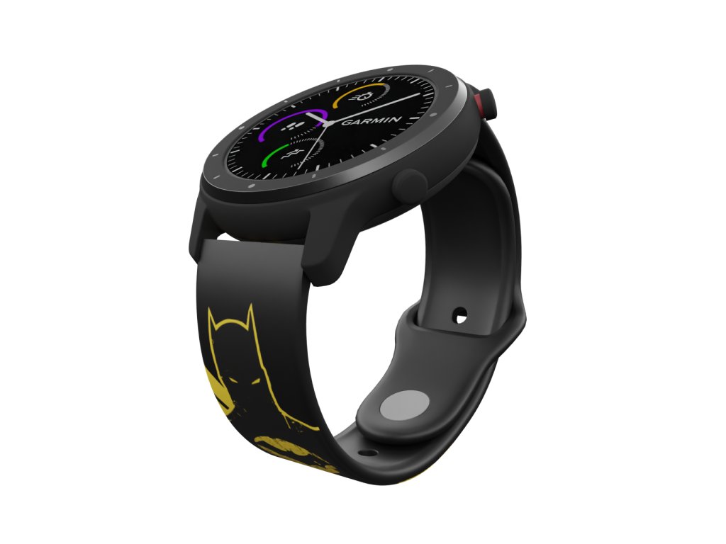 Černý řemínek se žlutou grafikou Batmana. Silueta a znak komiksové hrdiny DC Comics z temných stínů samotného Gotham City.