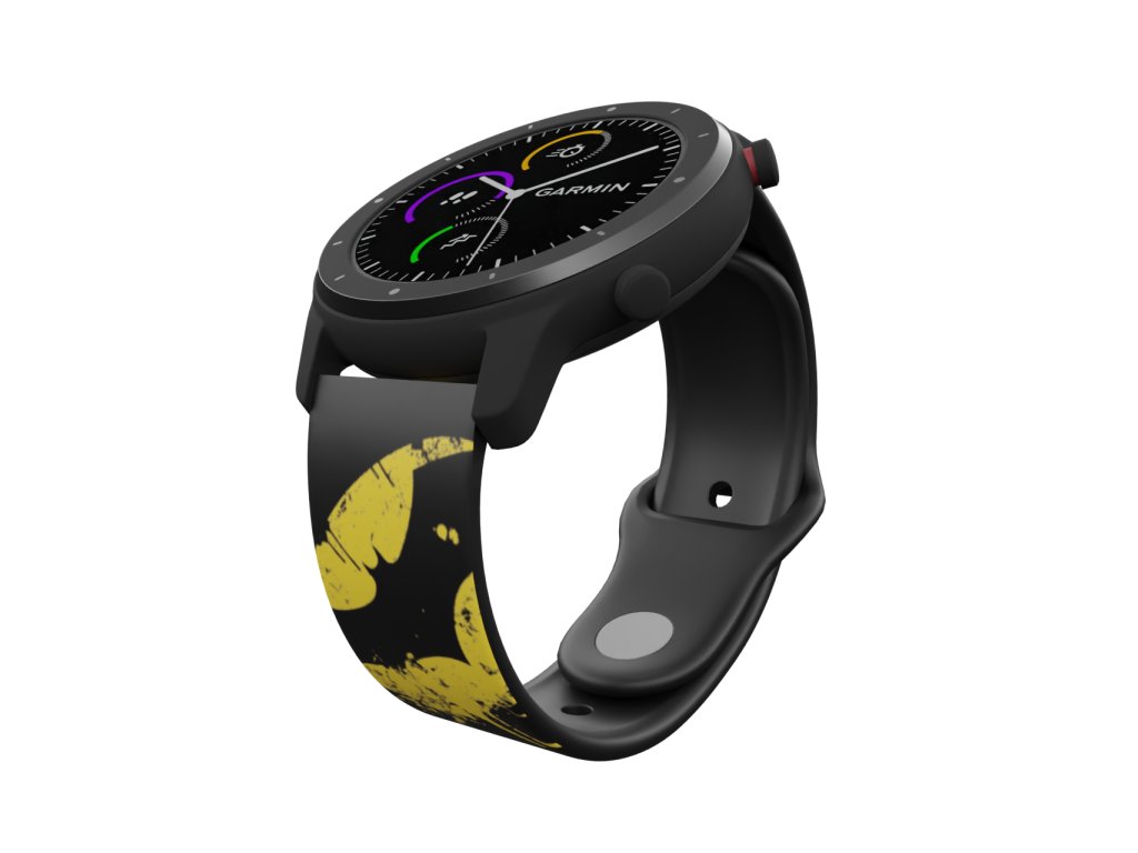 Černý řemínek se žlutou grafikou znaku Batmana. Znak komiksové hrdiny DC Comics z temných stínů samotného Gotham City.