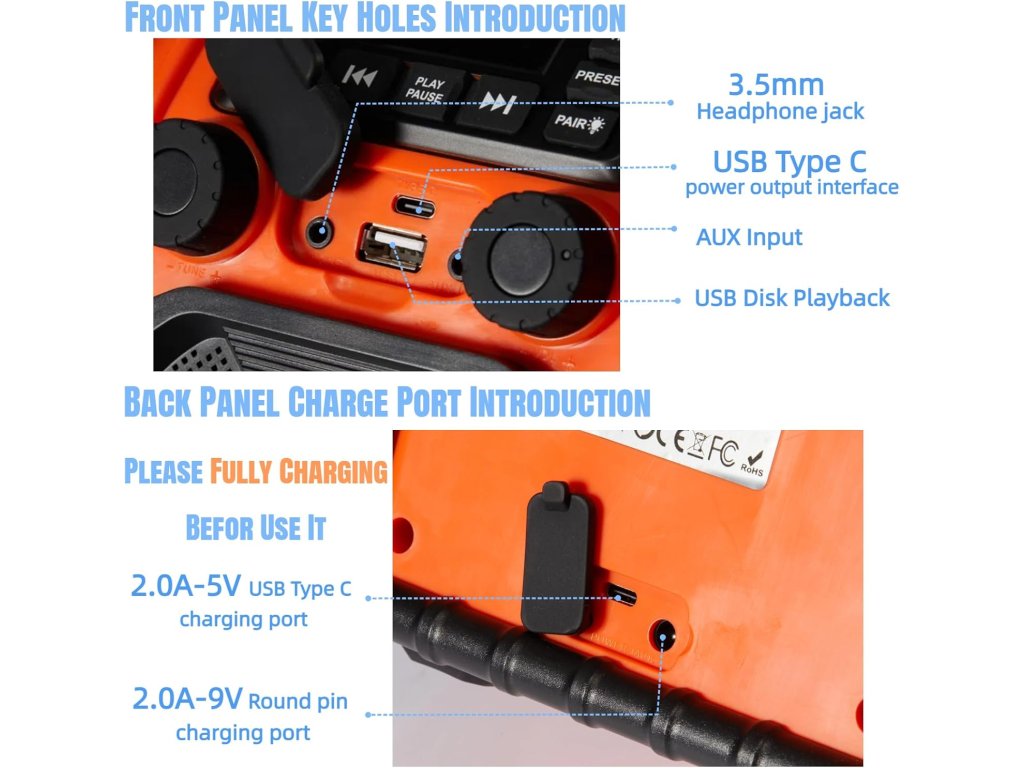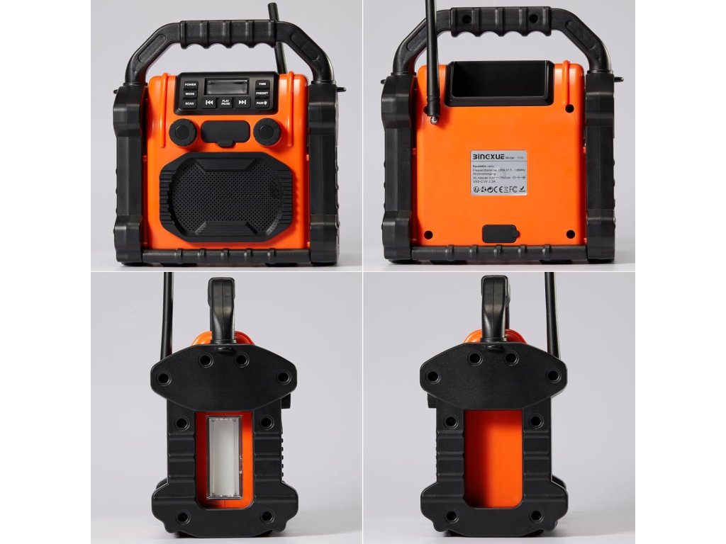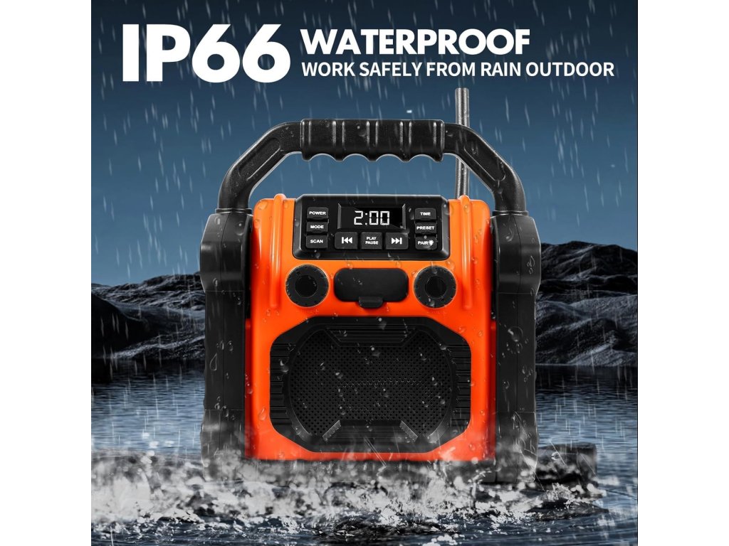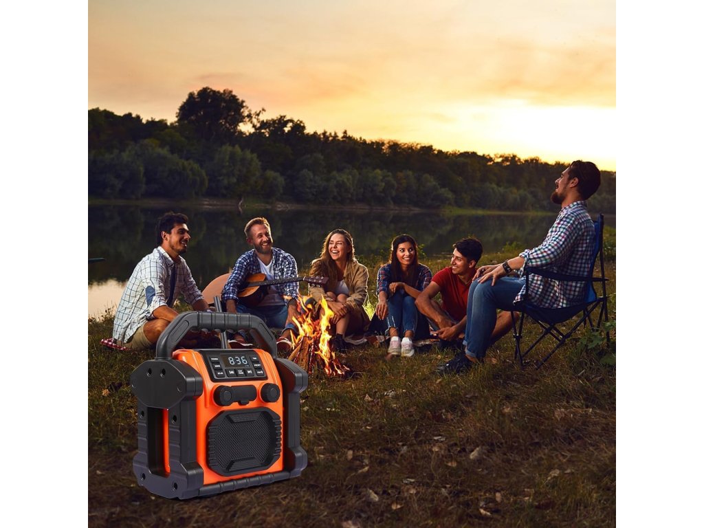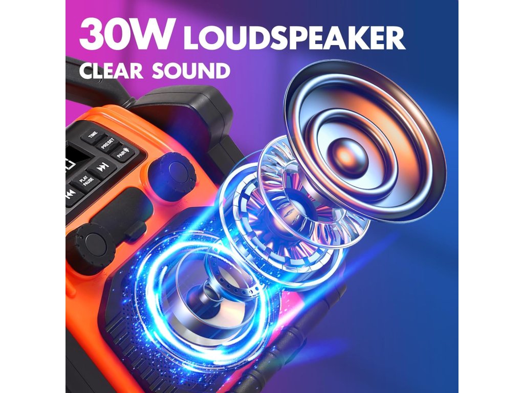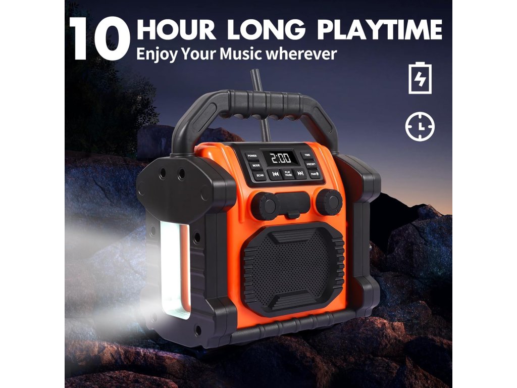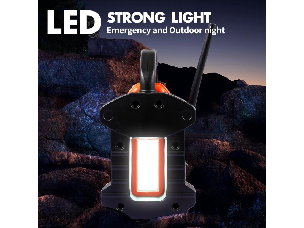 - Jasné LED světlo: Celý Bluetooth reproduktor s FM rádiem je vybaven stupněm krytí IPX55, je vodotěsný, prachotěsný a odolný proti nárazům. Vestavěné jasné LED světlo poskytuje jasné osvětlení, díky kterému je vaše poloha viditelná a bezpečná, když jste venku nebo kempujete v případě nouze.