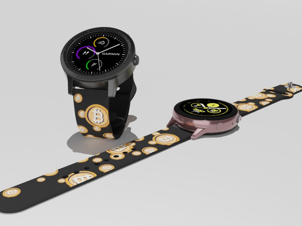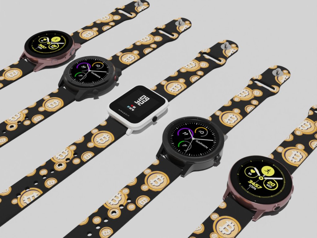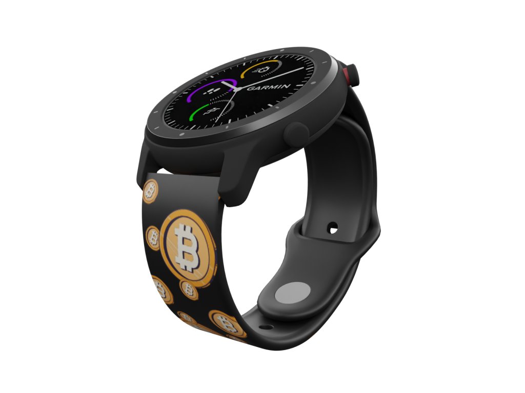 Černý náhradní řemínek má potisk bitcoinu, což je skvělá volba pro všechny fanoušky kryptoměn.