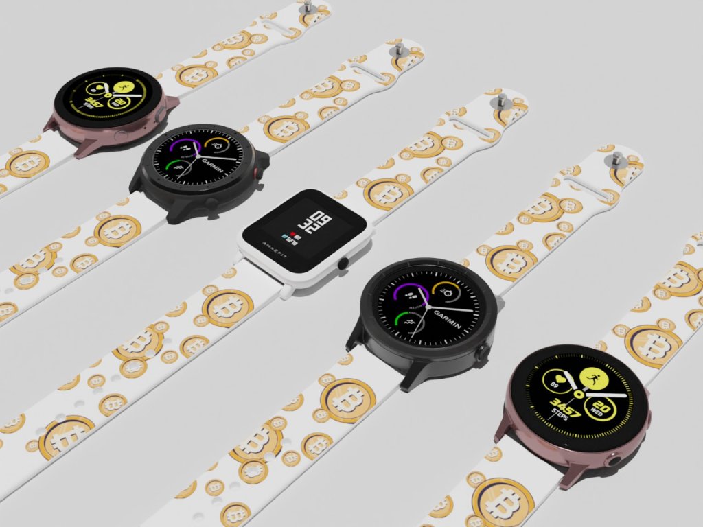 Bílý náhradní řemínek s potiskem bitcoinu, což je skvělá volba pro všechny fanoušky kryptoměn.