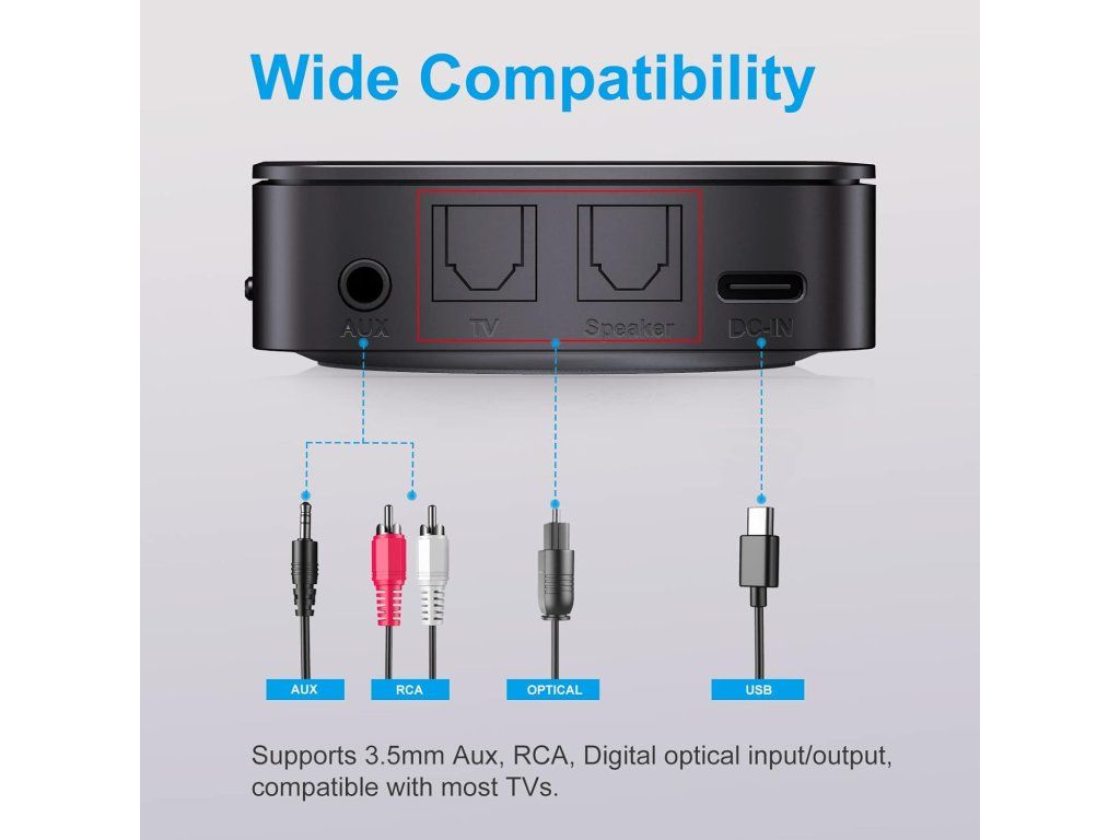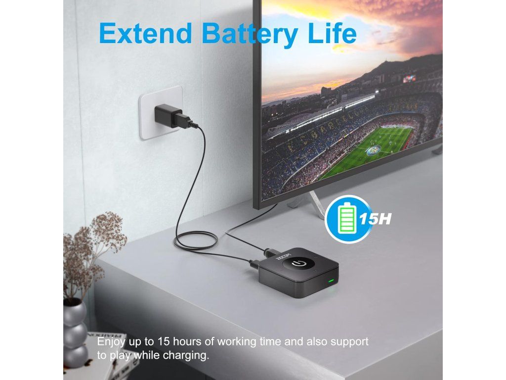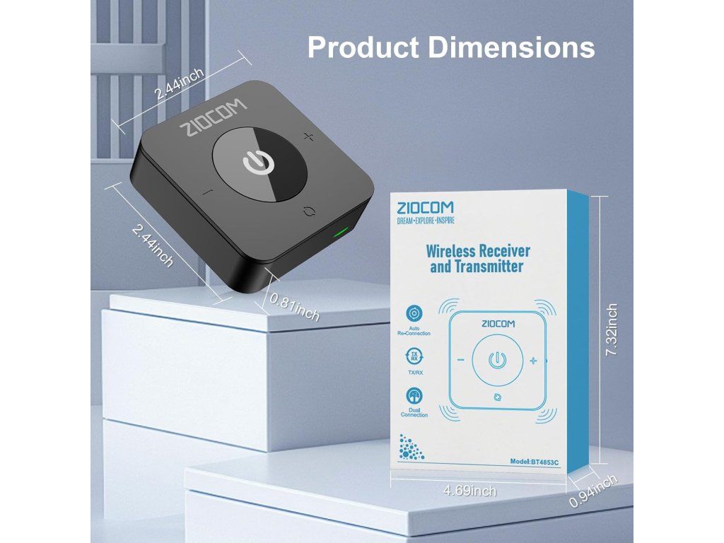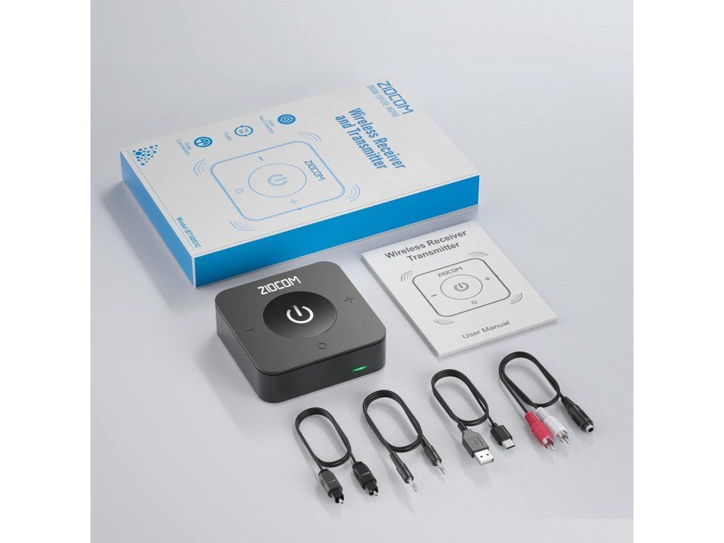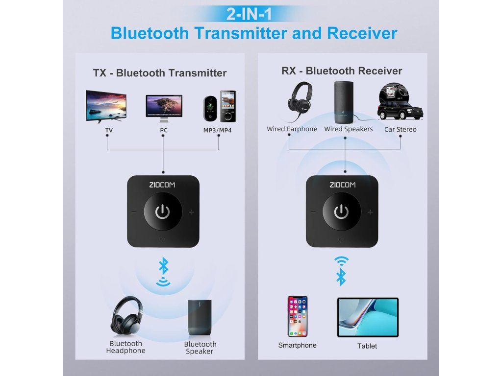 ZIOCOM Bluetooth adaptér je praktické 2v1 zařízení, které z klasických (kabelových) zařízení udělá bezdrátová. Funguje jako vysílač (TX) i přijímač (RX), takže můžeš například připojit Bluetooth sluchátka k televizi nebo naopak streamovat hudbu z mobilu do staršího stereo systému.