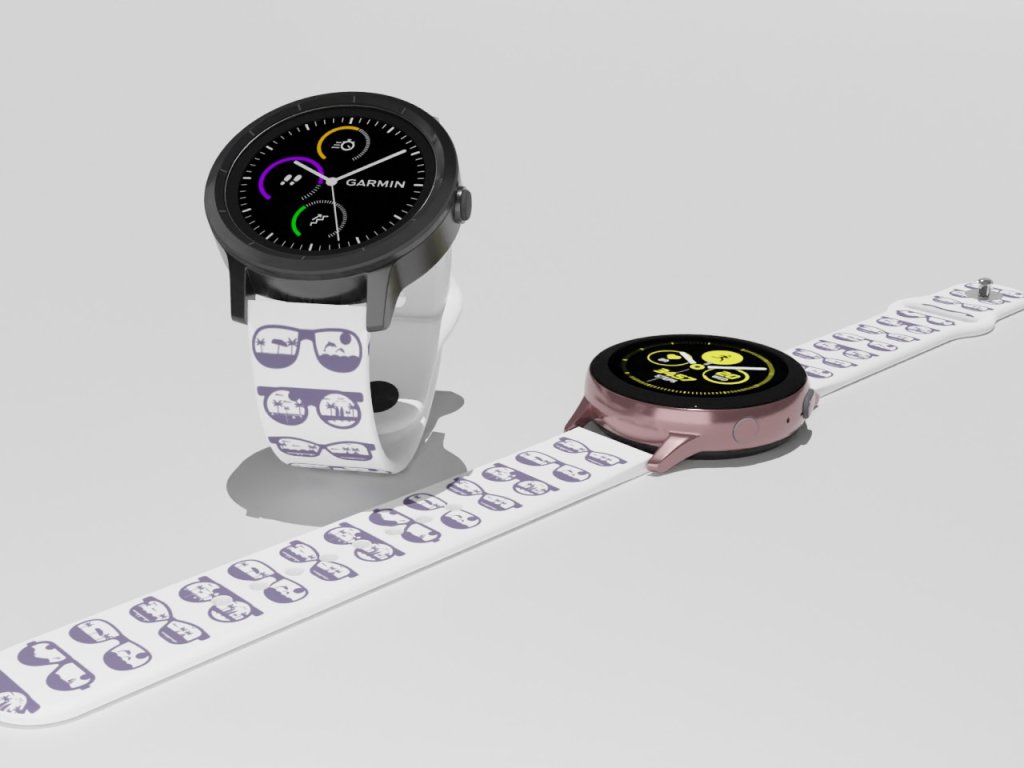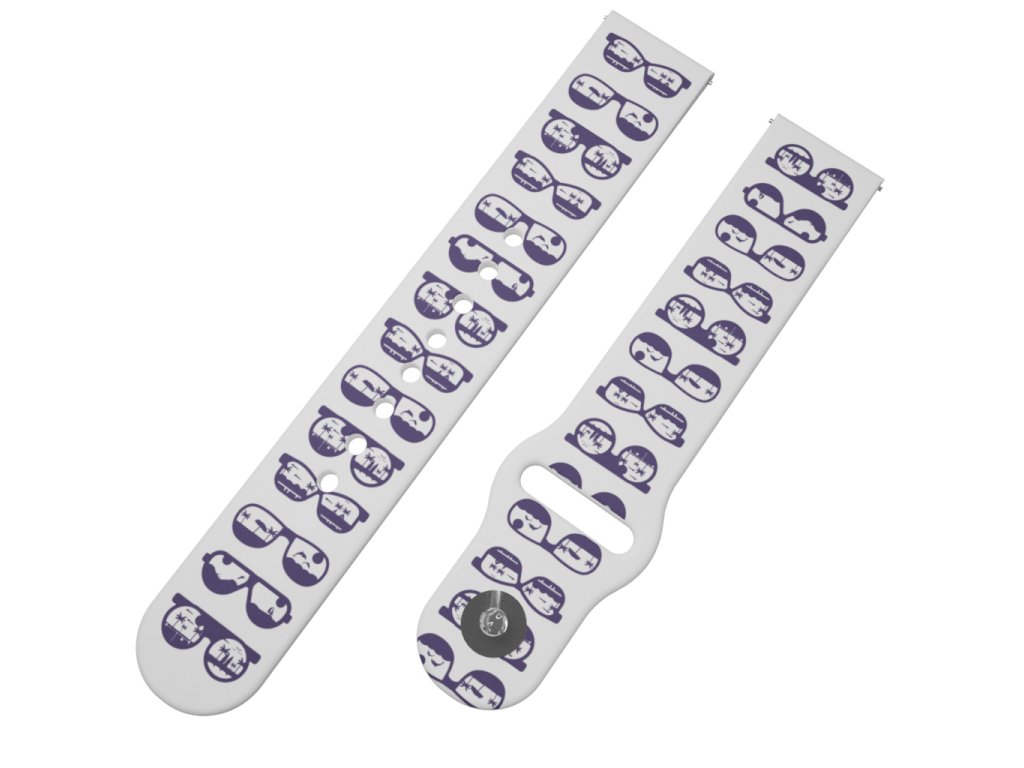 Bílý náhradní řemínek s potiskem fialových slunečních brýlí ve kterých ještě zůstaly odlesky letní dovolené.