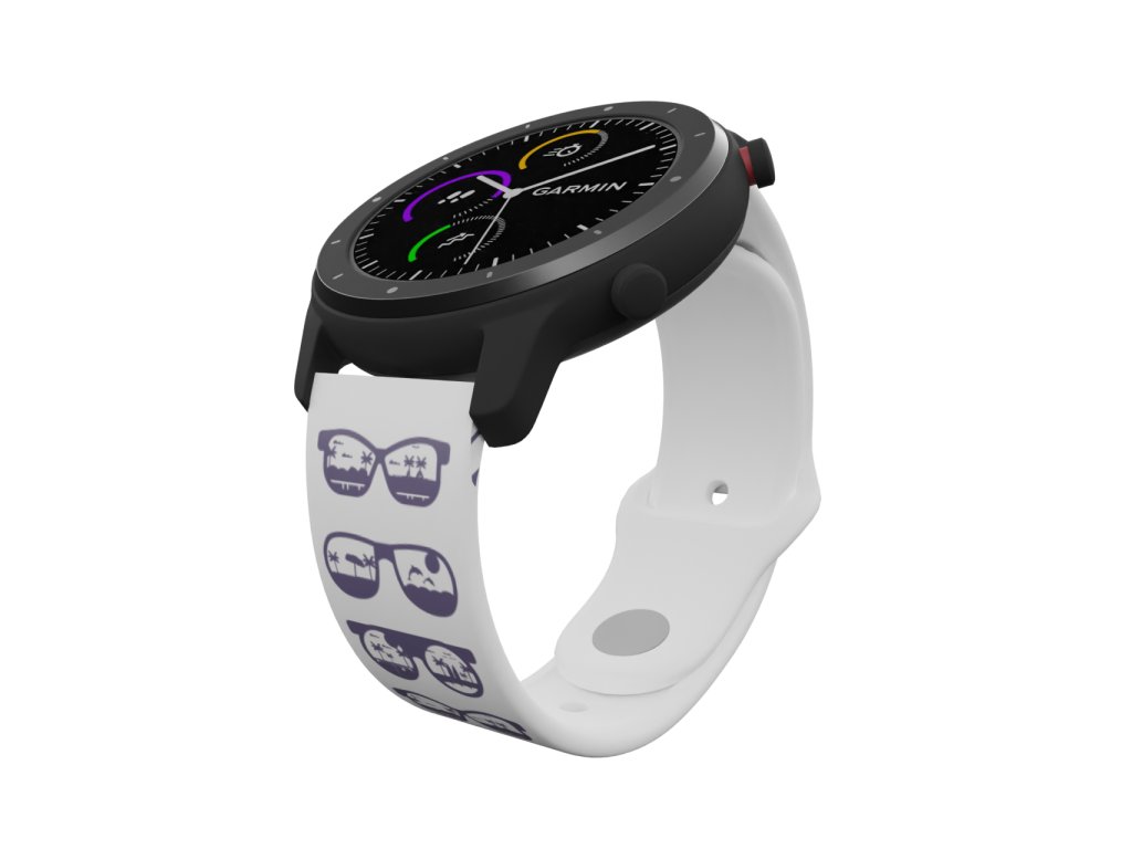 Bílý náhradní řemínek s potiskem fialových slunečních brýlí ve kterých ještě zůstaly odlesky letní dovolené. Potisk s motivem brýlí dodává hodinkám jedinečný a originální vzhled.
