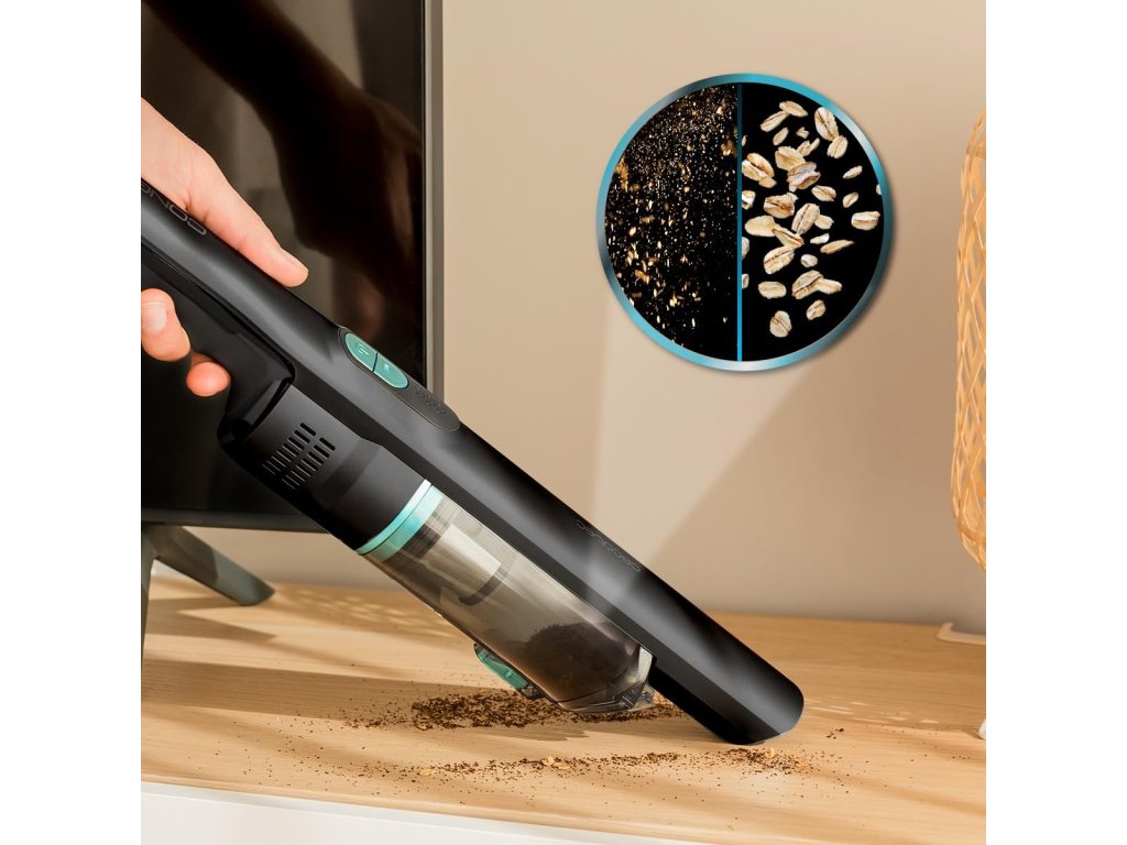 - Dva režimy: Eco a Turbo. Režim Eco prodlužuje baterii na maximum a poskytuje bezvadné výsledky a režim Turbo zabíjí ty nejodolnější nečistoty. Obsahuje příslušenství pro polstrování, příslušenství 2 v 1 pro nábytek a/nebo rohy, speciální příslušenství pro domácí zvířata a nabíjecí stanici.