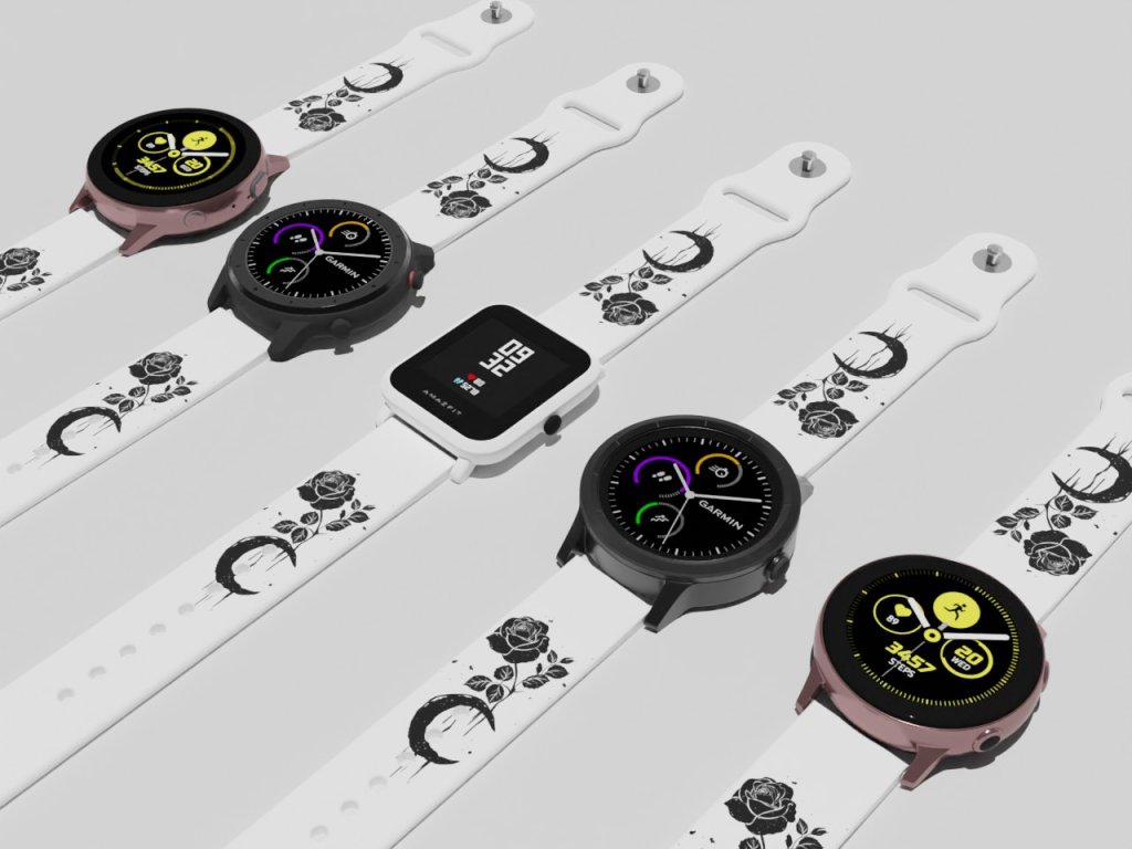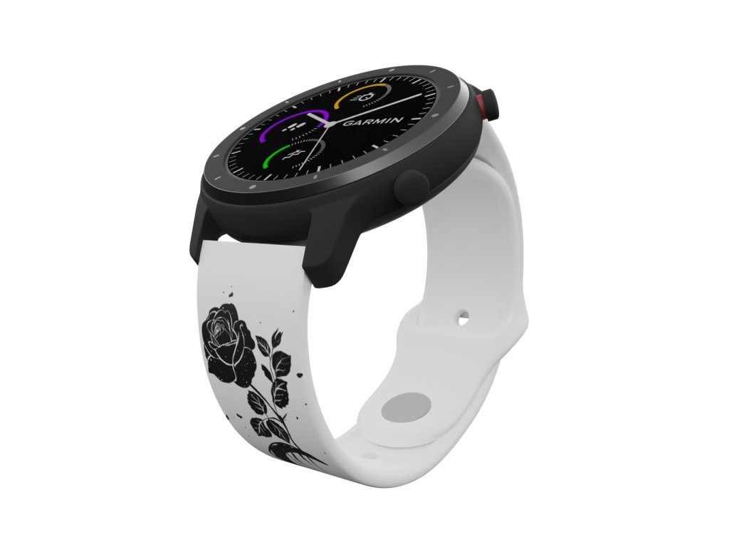 Bílý náhradní řemínek s černým potiskem růže. Potřebuješ náhradní pásek pro své chytré hodinky,
