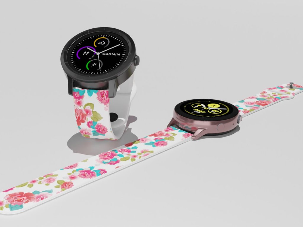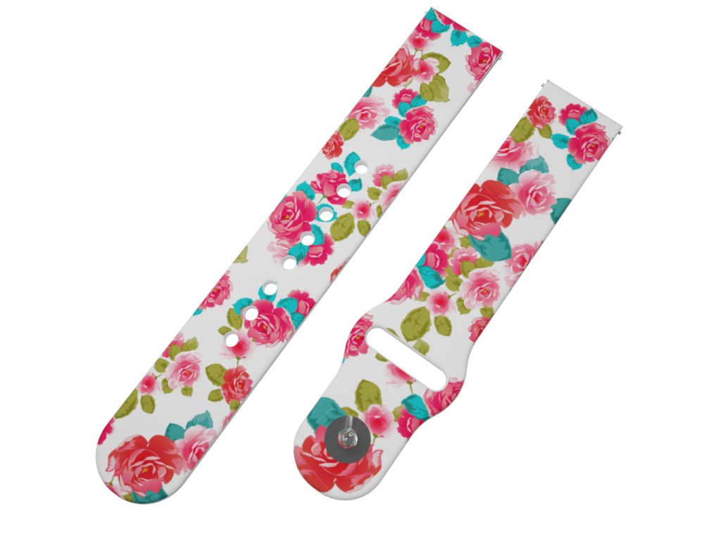 Bílý náhradní řemínek pro chytré hodinky s barevným potiskem červené růžičky. Omamná růžová vůně ve vintage stylu. To pravé pro milovníky květin. Pro originální a něžný vzhled vašich hodinek.