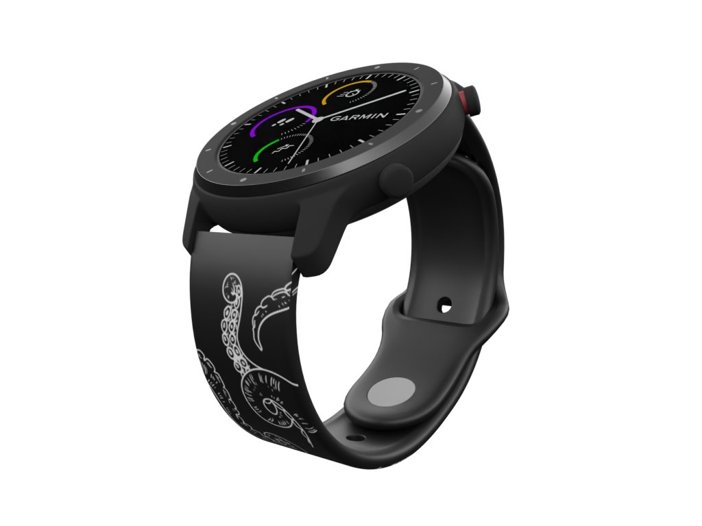 Černý náhradní řemínek pro chytré hodinky s potiskem bílých chapadel chobotnice. Nevíme, zda patří Hankovi nebo jiné známé chobotnici, to necháme odhalit vás.