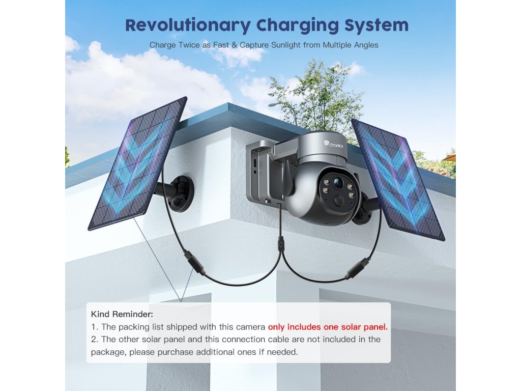 - Solární a revoluční nabíjecí systém] Solární bezpečnostní kamera ctronics může nabíjet baterii 5000 mAh přes solární panel 3,5 W (součástí dodávky je pouze jeden panel). Pokud si koupíte jiný solární panel s propojovacím kabelem solárního panelu, můžete je kombinovat v různých směrech a současně nabíjet současně. Efektivnějšího dvojitého nabíjecího výkonu lze dosáhnout pouze s jedním dalším solárním panelem