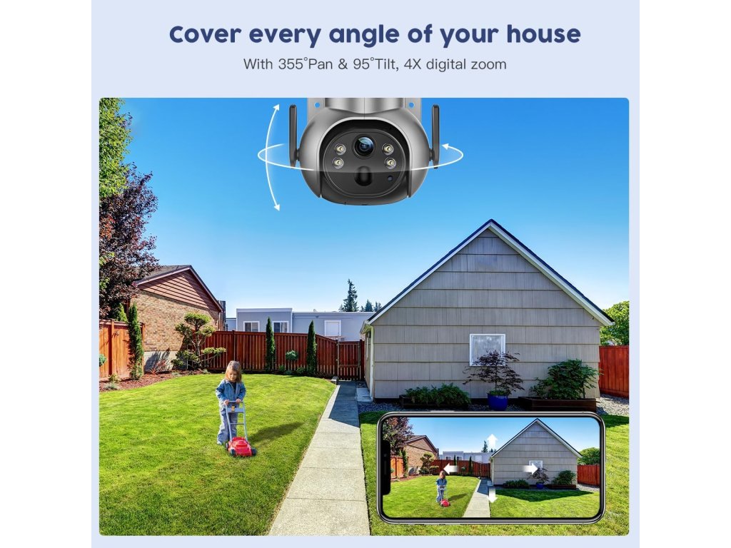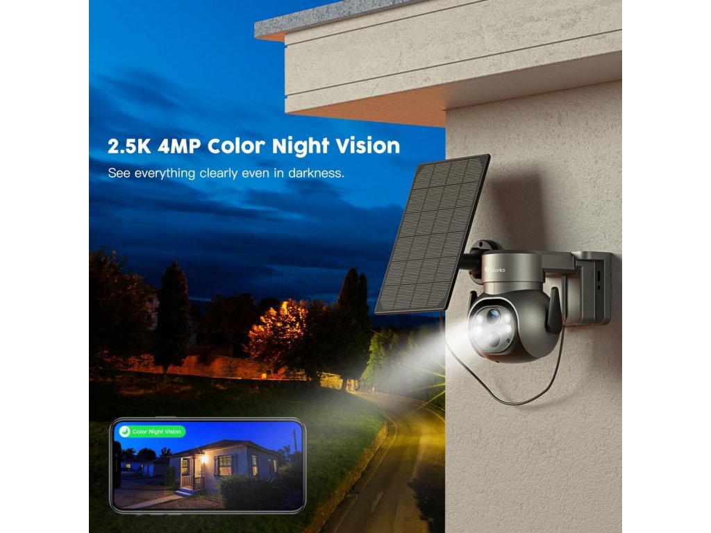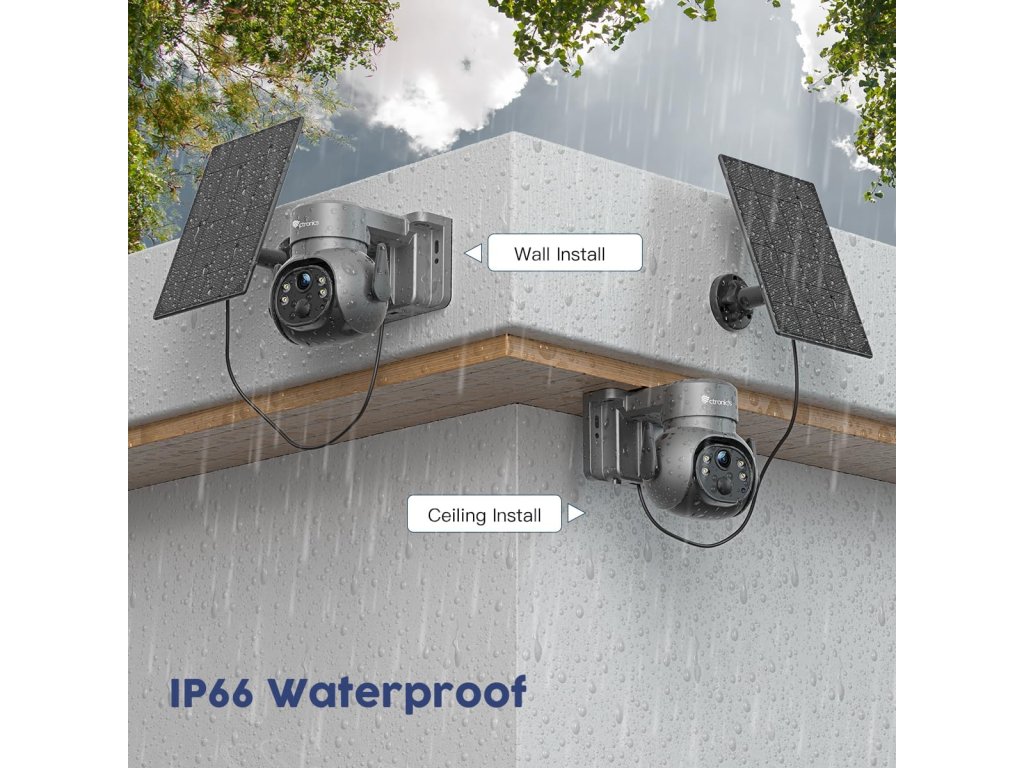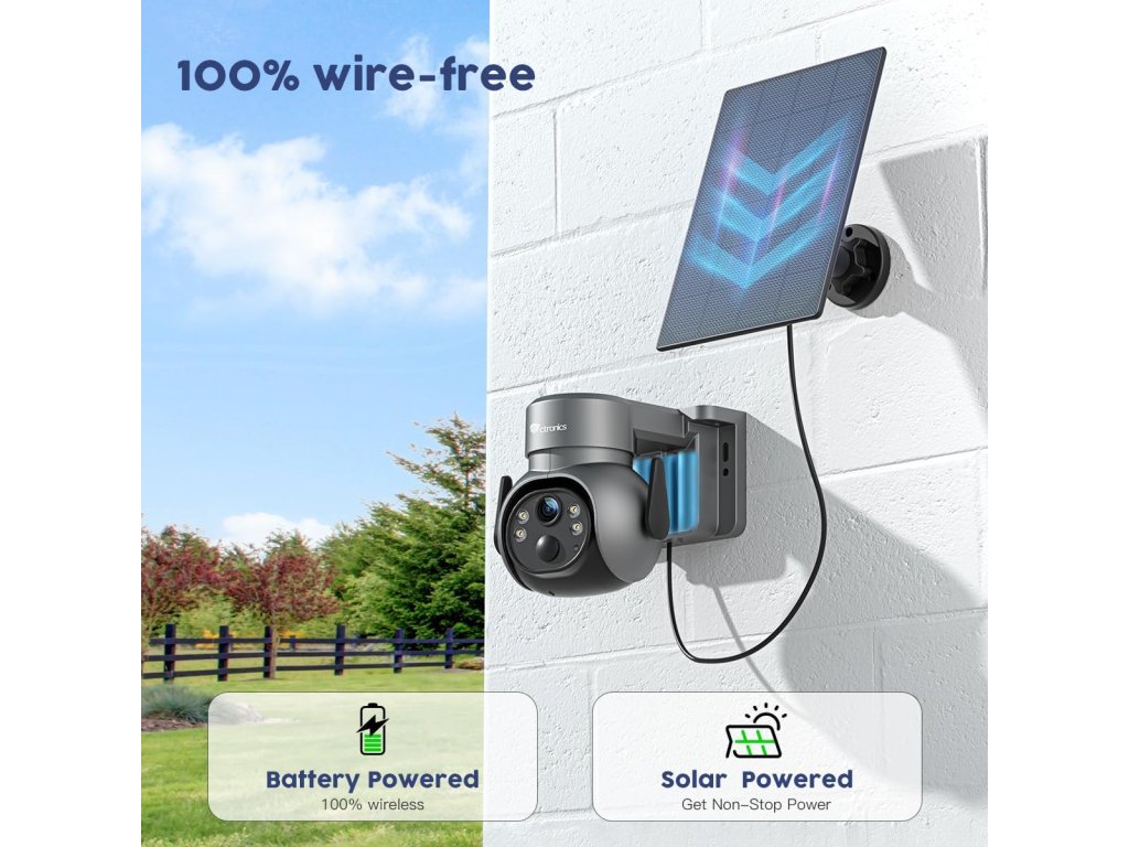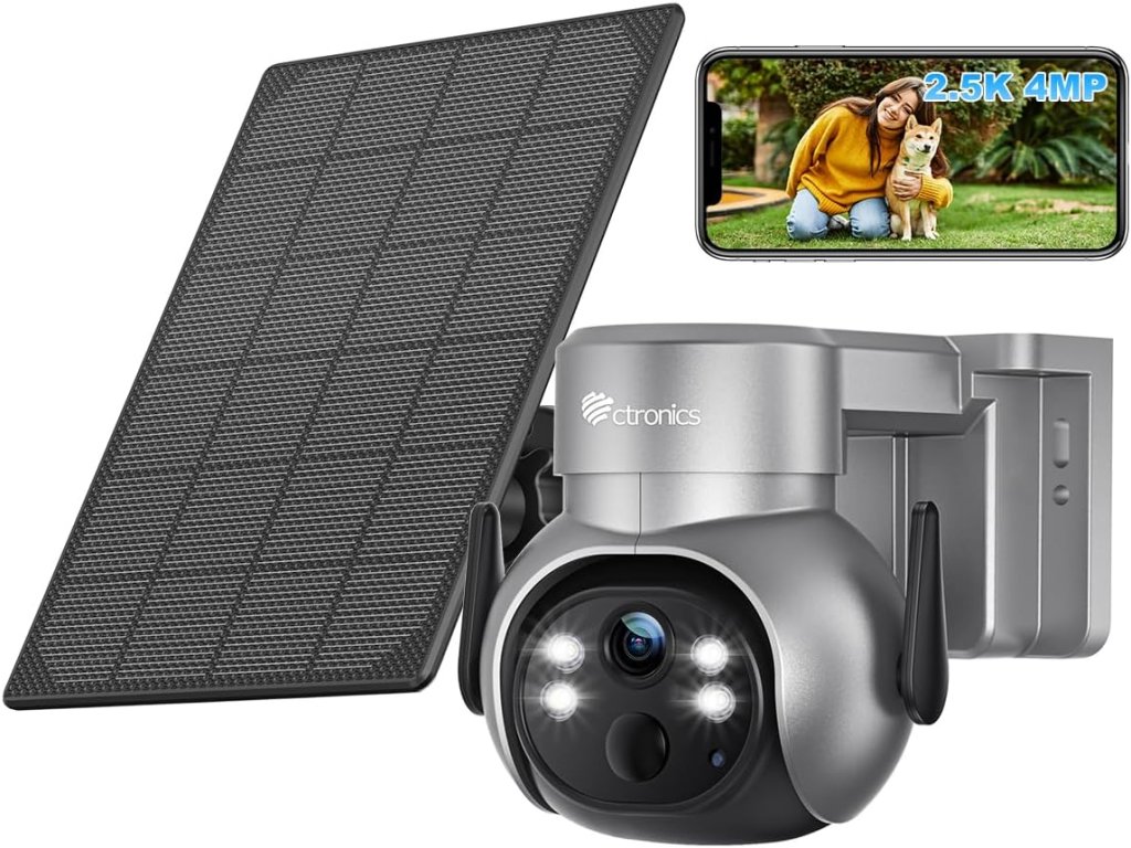 - [2,5K 4MP QHD a Smart 355°/95° PTZ] Tato solární bezpečnostní kamera je vybavena QHD pixely (2560 * 1440P) a 4násobným digitálním zoomem dokáže tato solární bezpečnostní kamera zachytit jasnější a širší detaily. S funkcí otáčení 355 ° a náklonem 95° vám nabízí širší zorné pole pro dálkové monitorování bez mrtvého úhlu. Můžete jej ovládat na dálku přes aplikaci "ctronics Pro", která je kompatibilní s iOS/Android. Počítače nejsou podporovány.