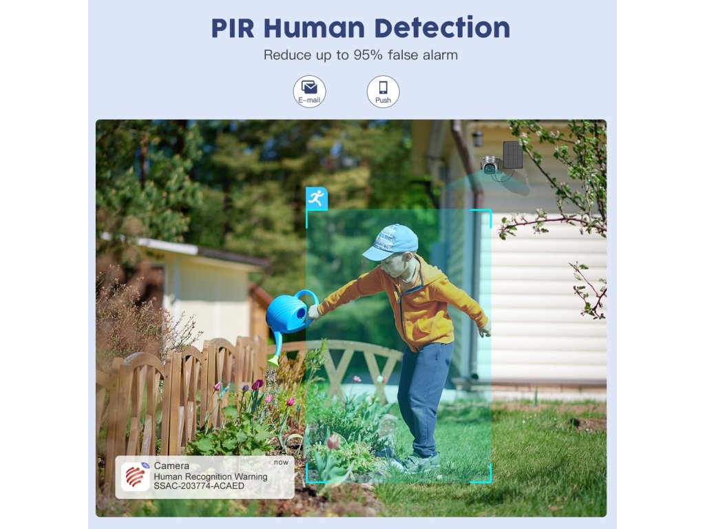 - [Lidské rozpoznání PIR a včasná oznámení] Tato venkovní solární kamera standardně umožňuje režim nízkého výkonu. Když detekuje teplotu a pohyby, aktivuje se senzor PIR za pouhých 0,2 sekundy. Navíc lidské rozpoznání může snížit o 95 % falešných poplachů. Můžete dostávat oznámení přes App-Push, e-mail a FTP. Jeho sledovací vzdálenost činí až 12 m. Můžete zůstat vždy informováni o solární kameře.