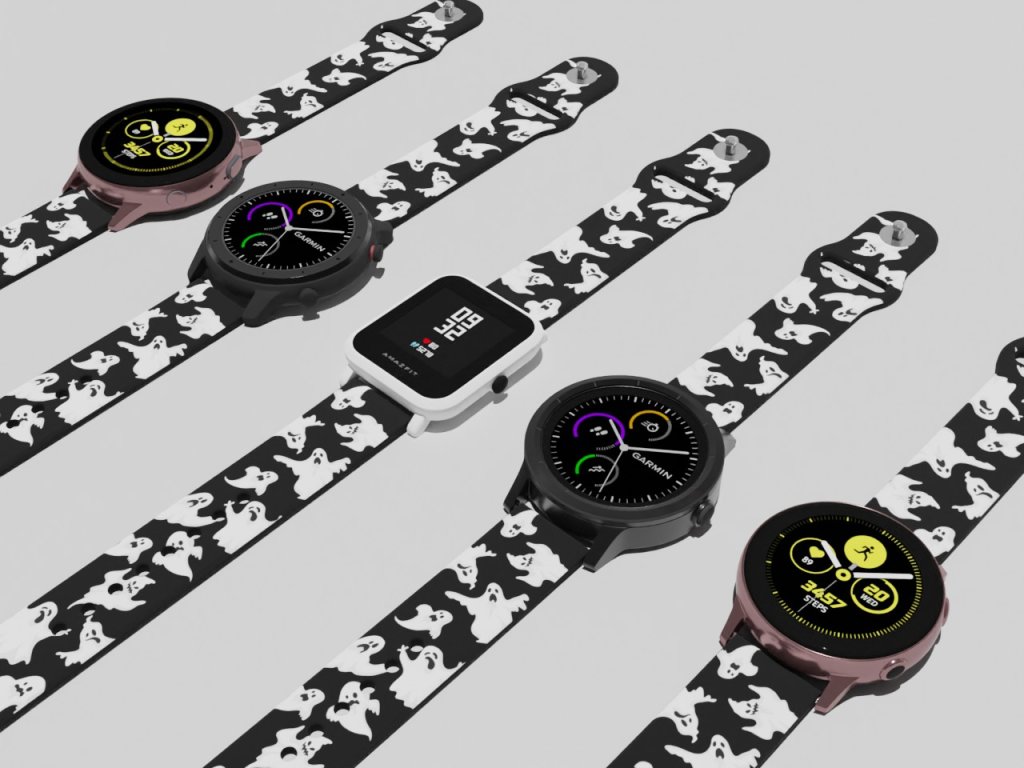 Černý náhradní řemínek pro chytré hodinky s bílým potiskem duchů jako z Ghostbusters.