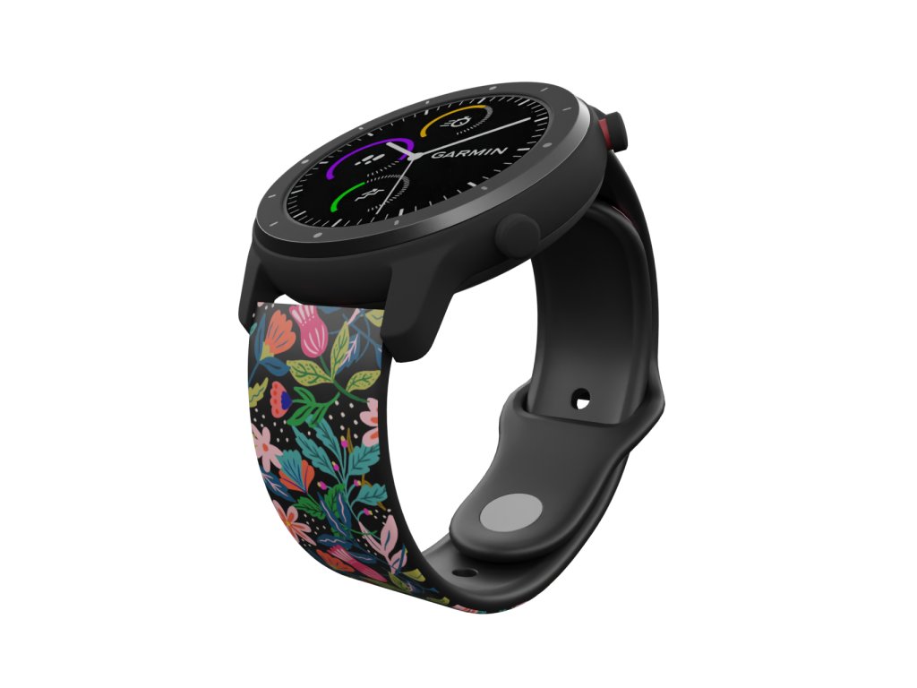 Černý řemínek s výraznou barevnou grafikou nespoutané džungle. Spousta rostlin, květin a barev,