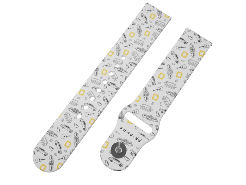 Bílý náhradní řemínek pro chytré hodinky s potiskem prvků ze seriálu Přátelé. Černý potisk se žlutým rámečkem plný miniatur, které jsou ikonické pro tento nesmrtelný seriál.