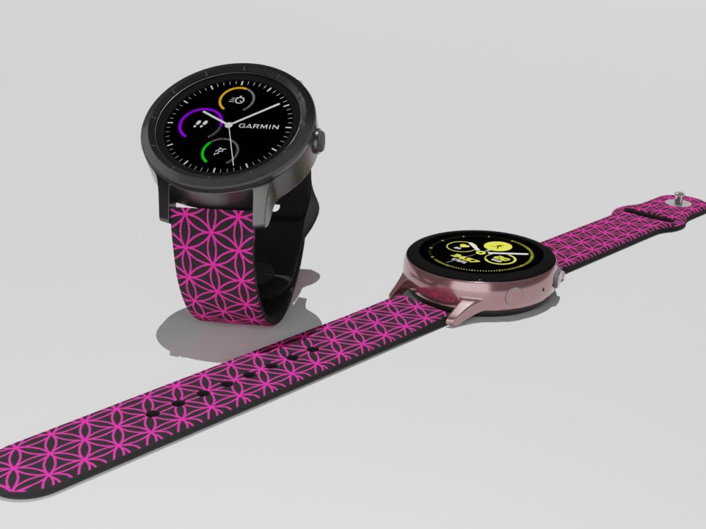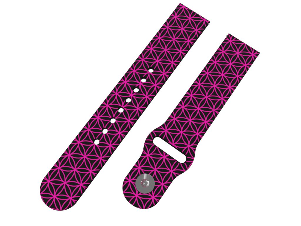 Černý náhradní řemínek pro chytré hodinky s fialovým potiskem kruhů. Pro milovníky geometrie a pravidelnosti ten pravý pásek pro hodinky.