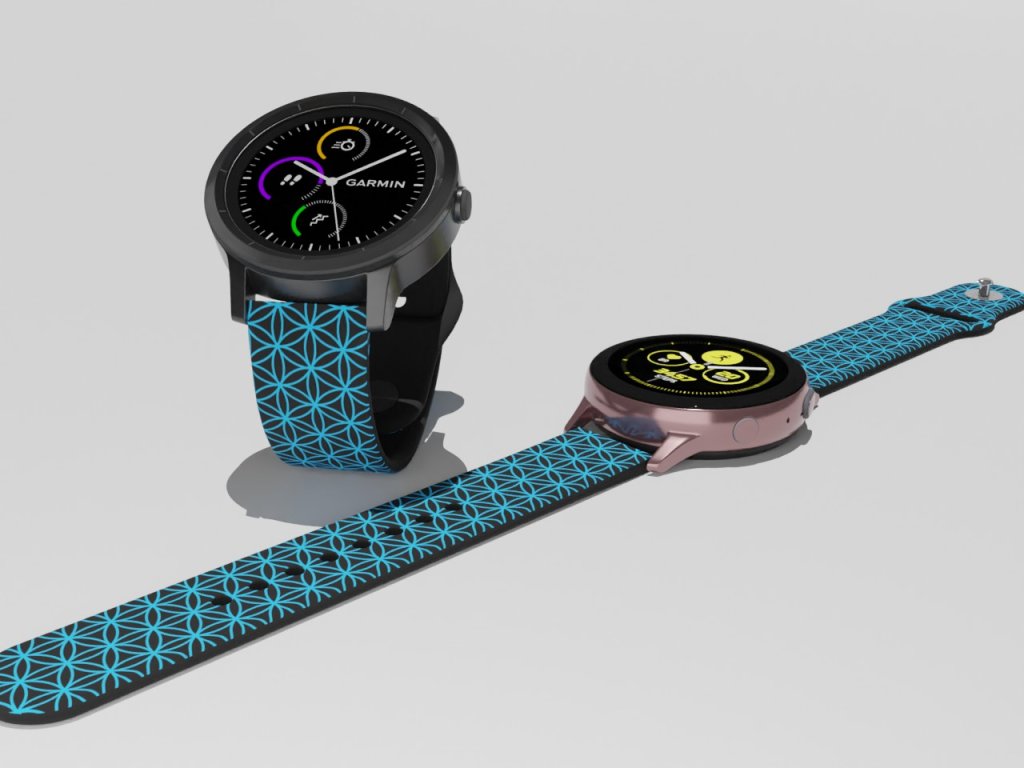Černý náhradní řemínek pro chytré hodinky s modrým potiskem kruhů.