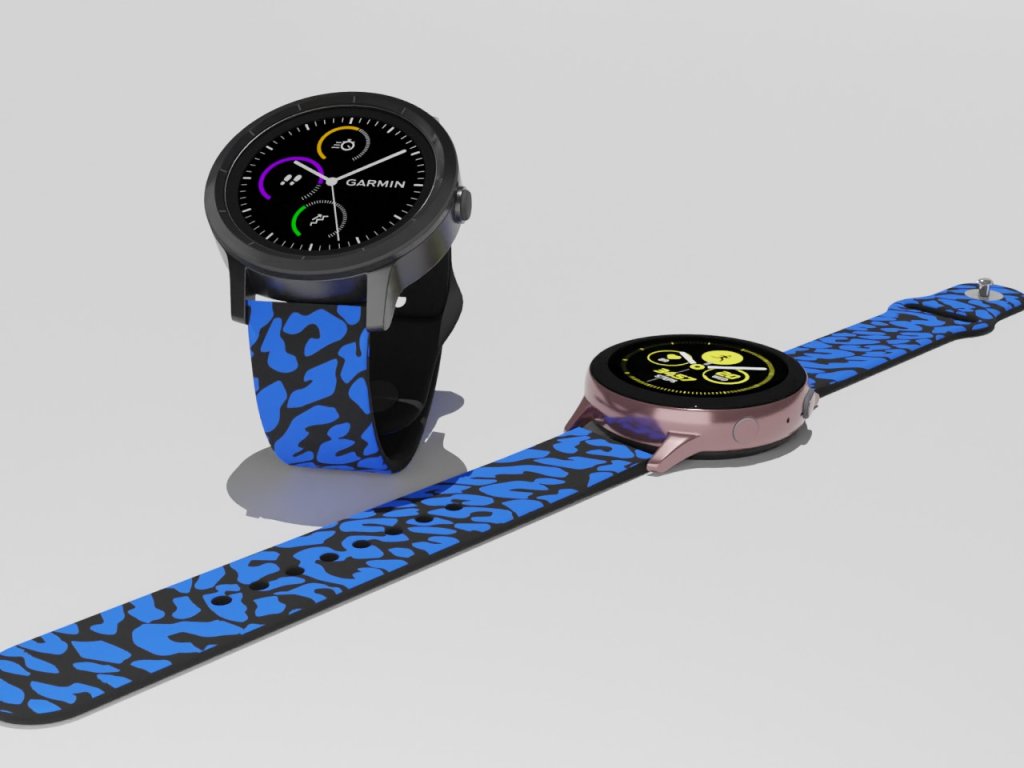 Černý náhradní řemínek pro chytré hodinky s leopardím potiskem v modré barvě.