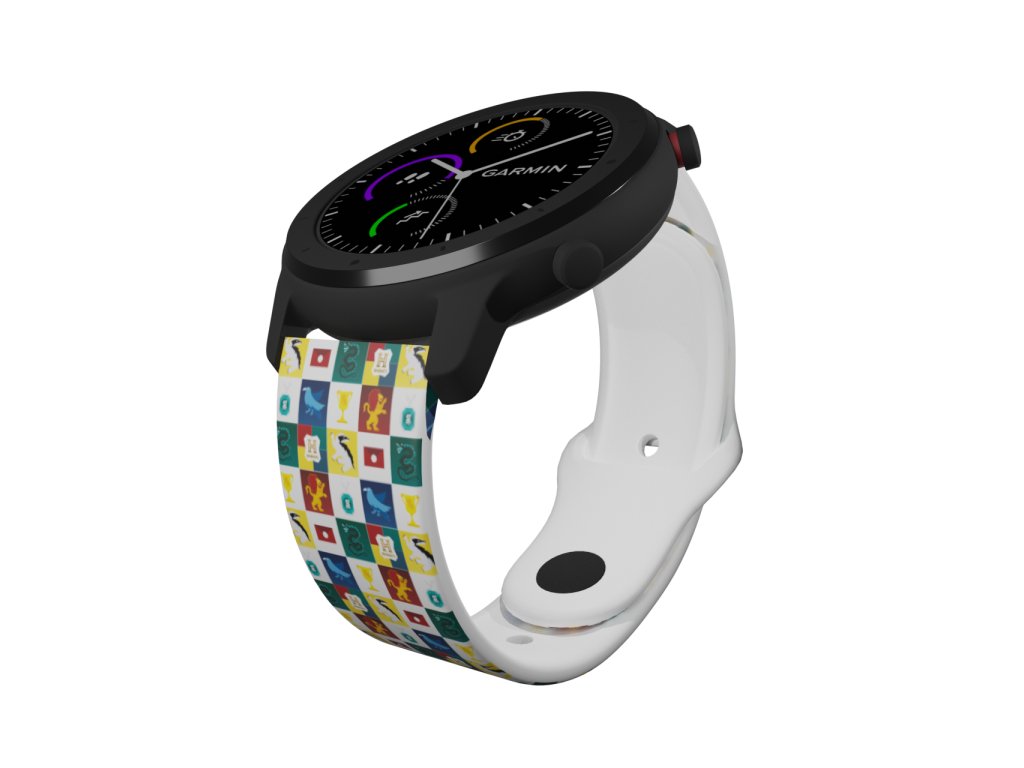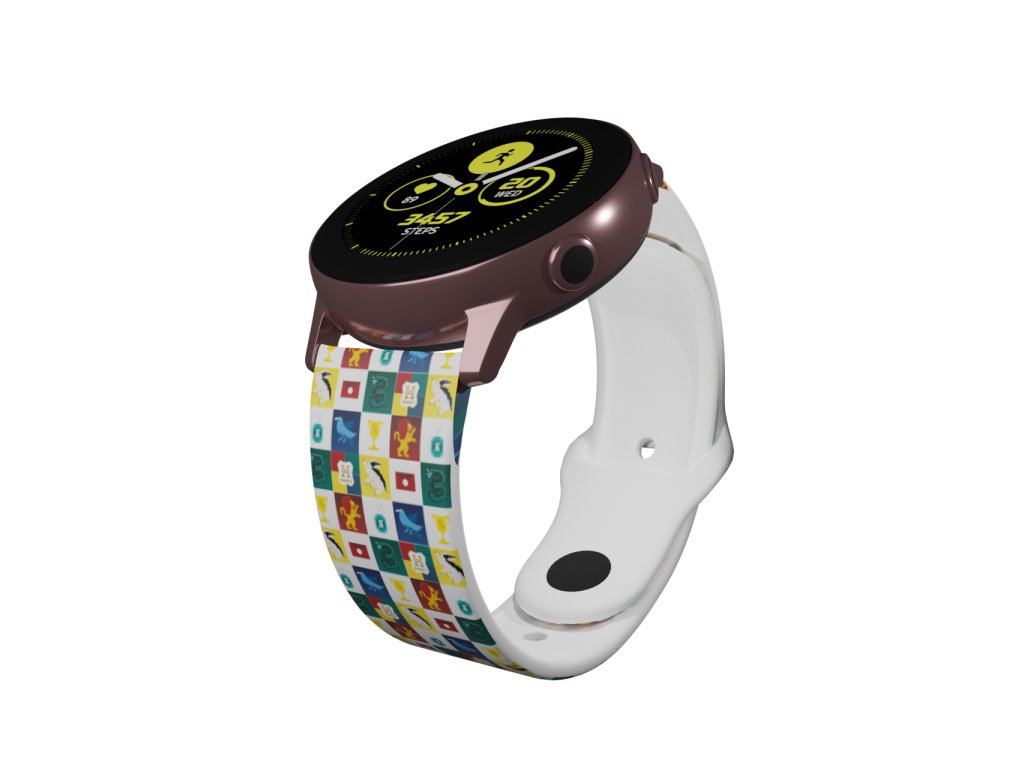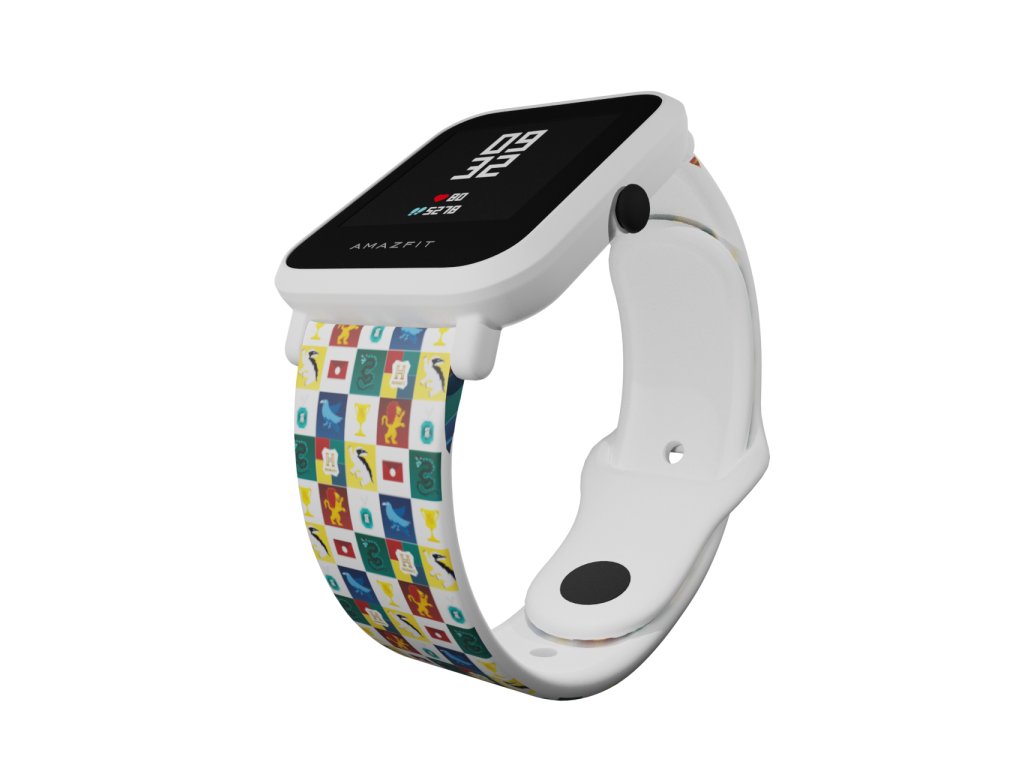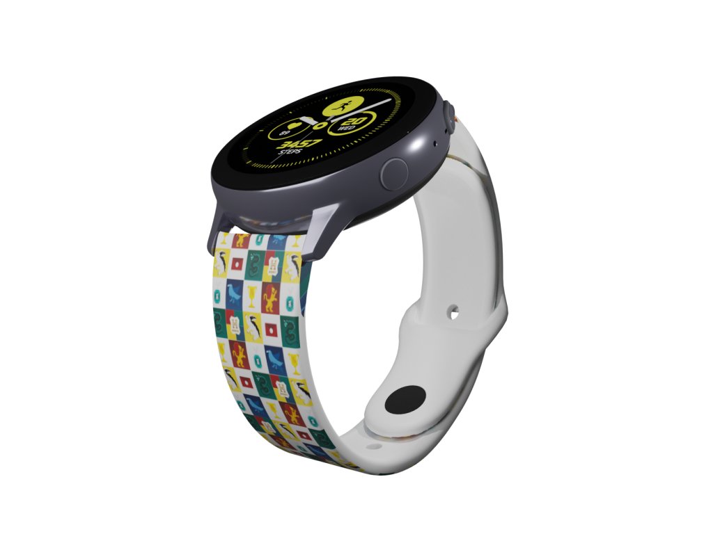 Bílý náhradní řemínek se symboly a maskoty všech kolejí Bradavické školy čar a kouzel.