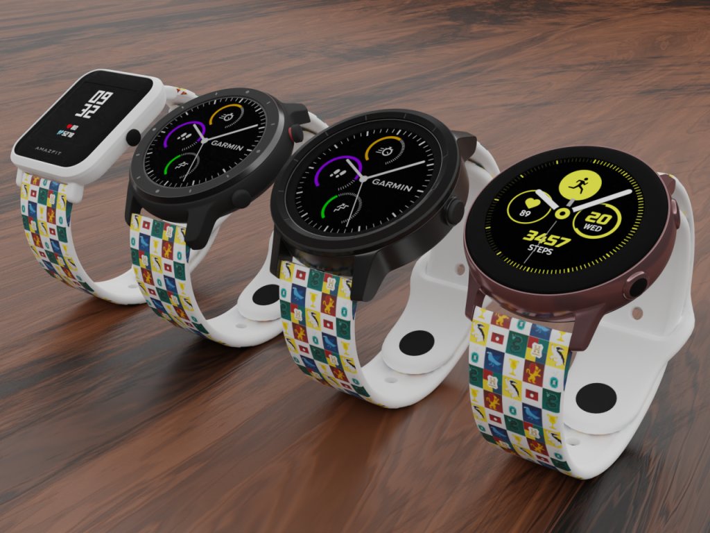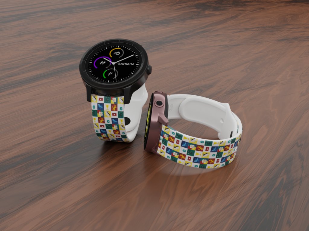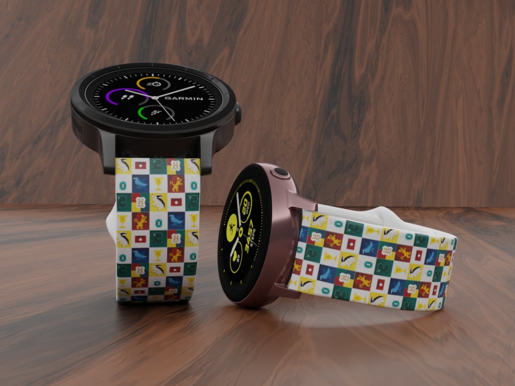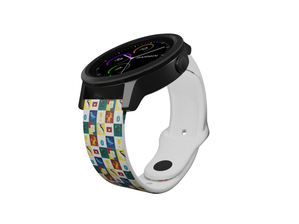 Bílý náhradní řemínek se symboly a maskoty všech kolejí Bradavické školy čar a kouzel.