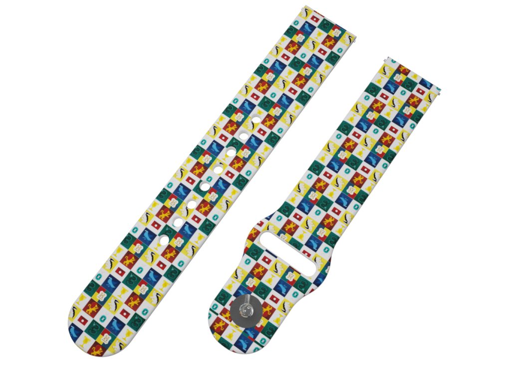 Potištěný univerzální řemínek naší vlastní výroby ve velikosti 22 mm s designem "HARRY POTTER - BRADAVICKÉ KOLEJE 2" pro obvod zápěstí 15 - 23 cm.