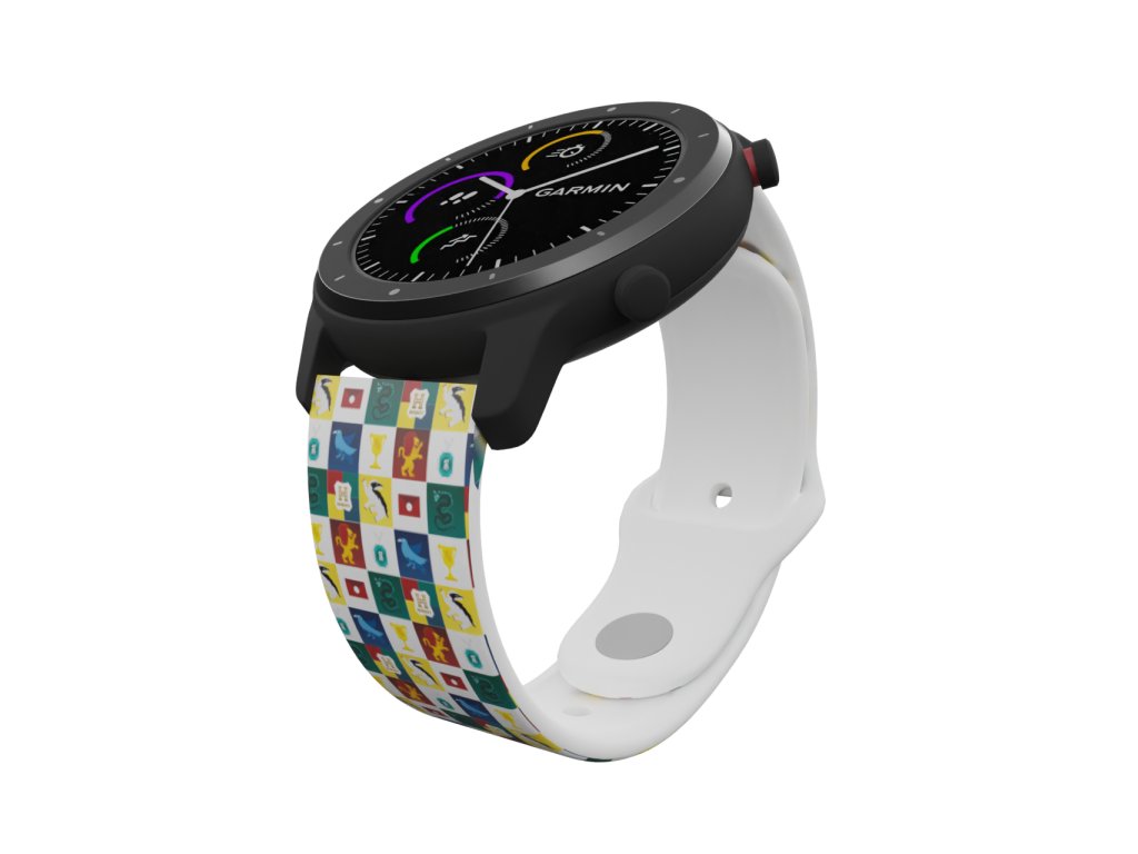 Bílý náhradní řemínek se symboly a maskoty všech kolejí Bradavické školy čar a kouzel. Nebelvír, Havraspár, Mrzimor a Zmijozel. Každá z kolejí v Bradavicích má svého vlastního maskota, který symbolizuje vlastnosti a hodnoty, které jsou důležité pro danou kolej. Lev, Orel, Had a Jezevec.