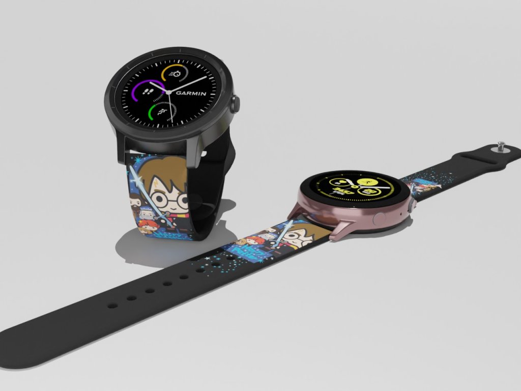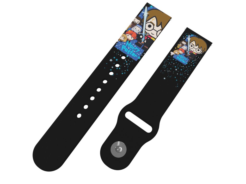 Černý náhradní řemínek pro chytré hodinky s barevným potiskem postav z Bradavické školy čar a kouzel. Vítejte v kouzelnickém světě Harryho Pottera.