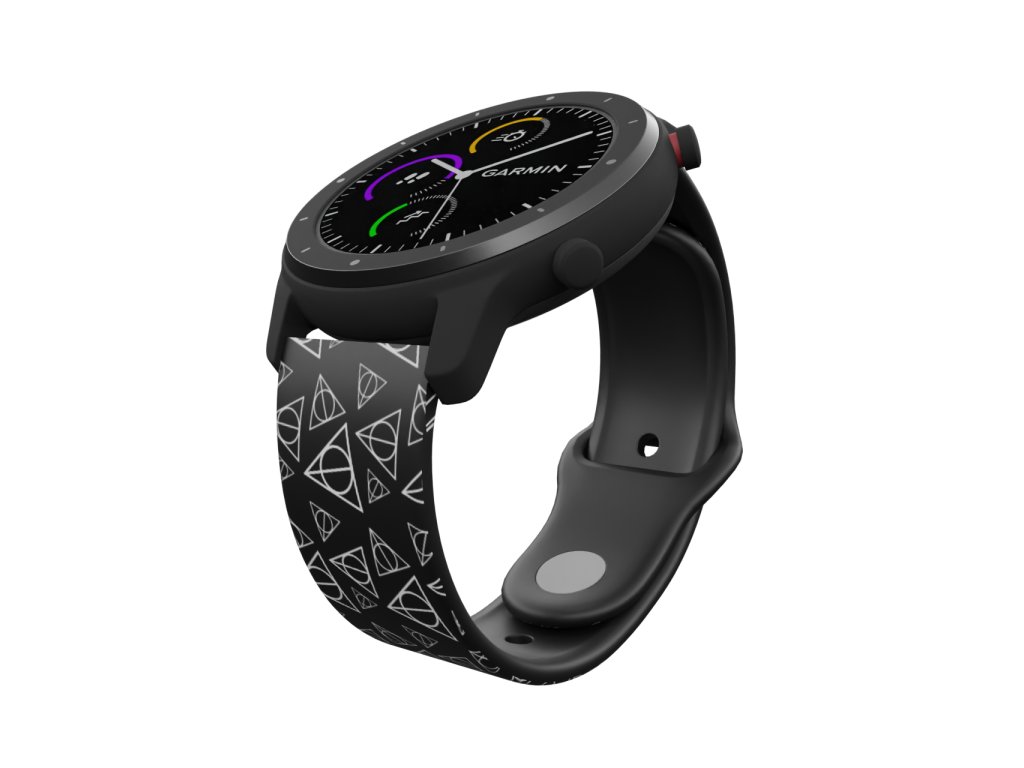 Černý náhradní řemínek pro chytré hodinky s potiskem relikvie smrti. Relikvie Smrti jsou tři vzácné a mocné artefakty, které podle legendy kdysi darovala sama Smrt bratrům Peverellovým. Vítejte v kouzelnickém světě Harryho Pottera.