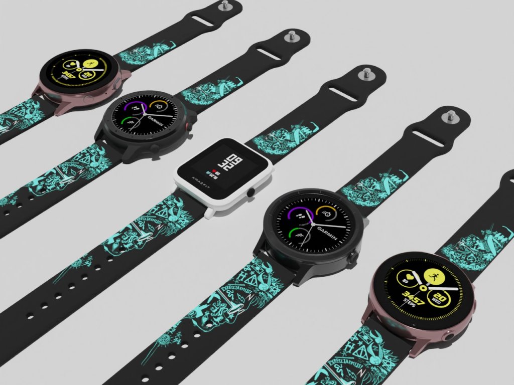 Černý náhradní řemínek pro chytré hodinky s potiskem typických symbolů