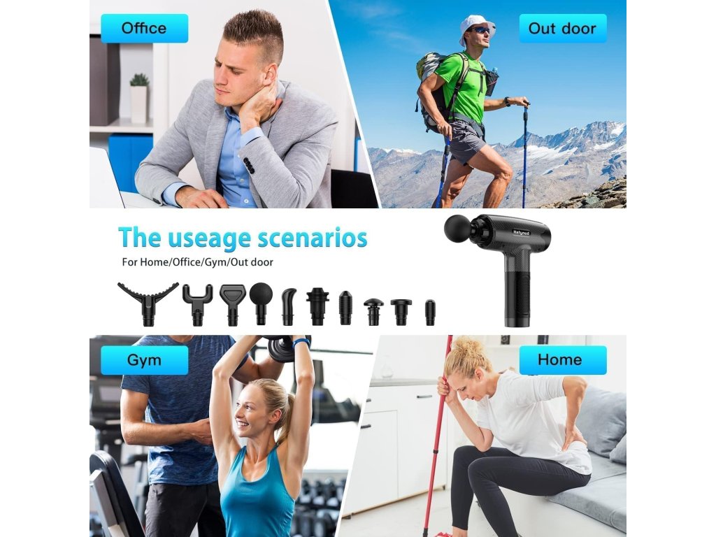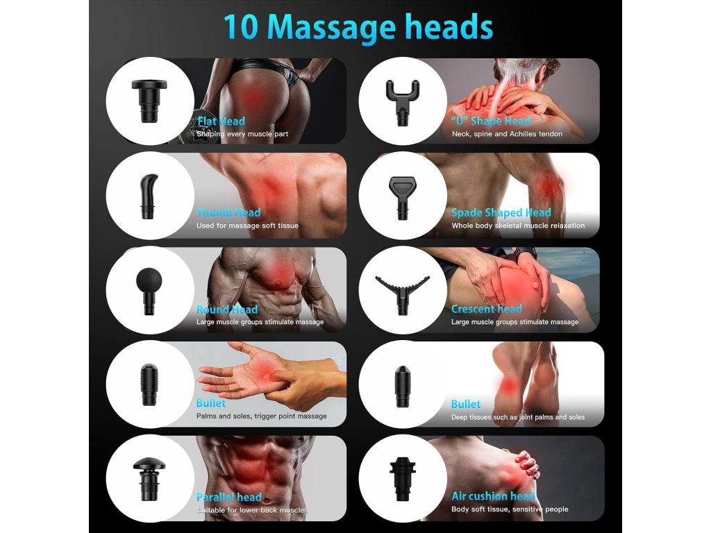 - 10 vyměnitelných masážních hlav: 10 masážních hlav na míru vám umožní dosáhnout každého svalu a nabízí cílenou masážní hlavu pro každý sval.