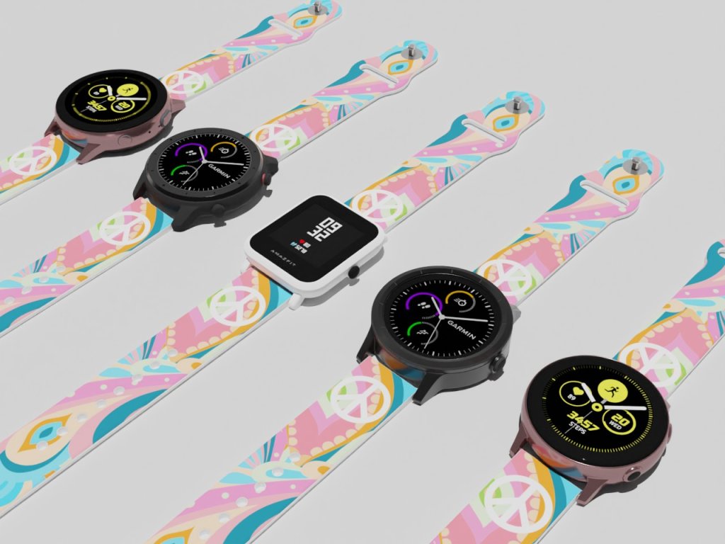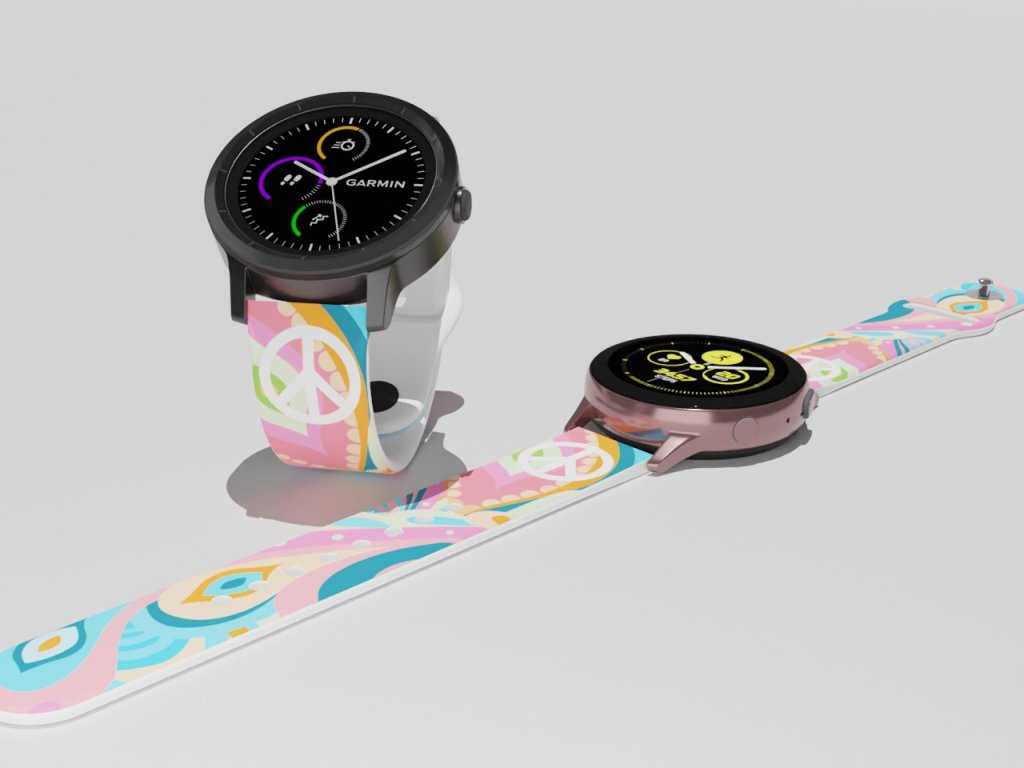 Bílý náhradní řemínek pro chytré hodinky s barevným celopotiskem ve stylu Hippies.