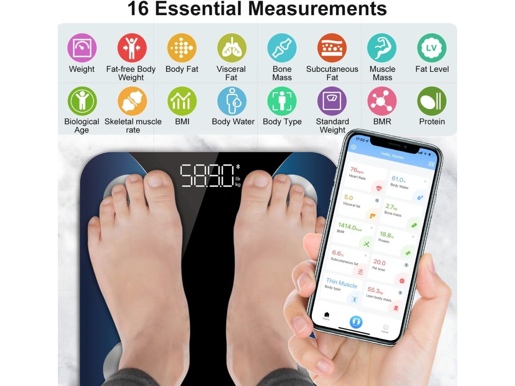 - 16 analyzovaných údajů o těle -- Jakmile nainstalujete aplikaci "Fitdays" a zadáte údaje o Vaší osobě (velikost, věk, pohlaví), můžete sledovat údaje o svém těle. Jsou uvedeny mimo jiné hmotnost, BMI, tělesný tuk, tělesná hmotnost bez tuku, podkožní tuk, viscerální tuk, tělesná voda, rychlost kosterního svalstva, svalová hmota, kostní hmota, proteiny, BMR, standardní hmotnost, typ těla, obezita, biologický věk.